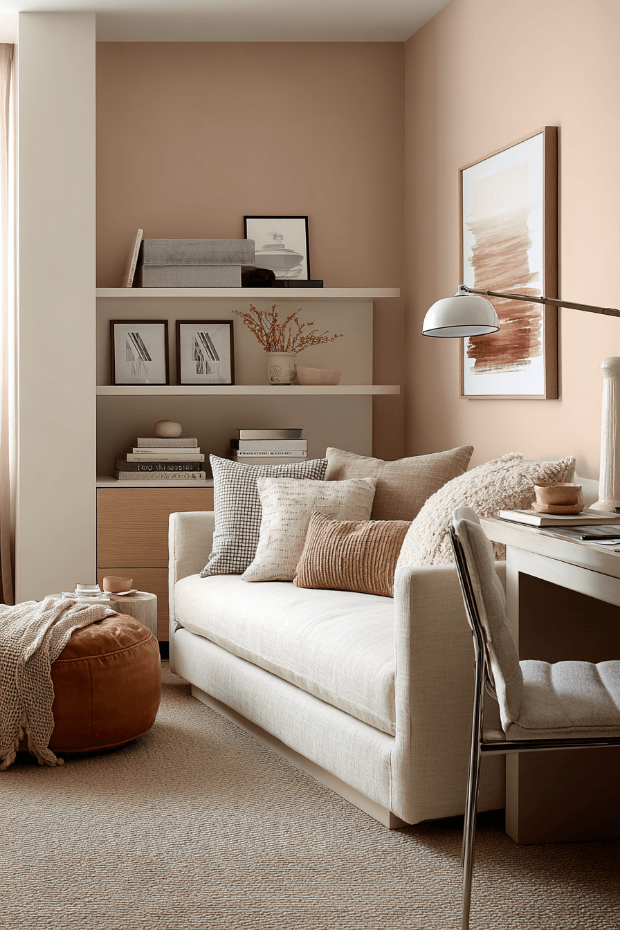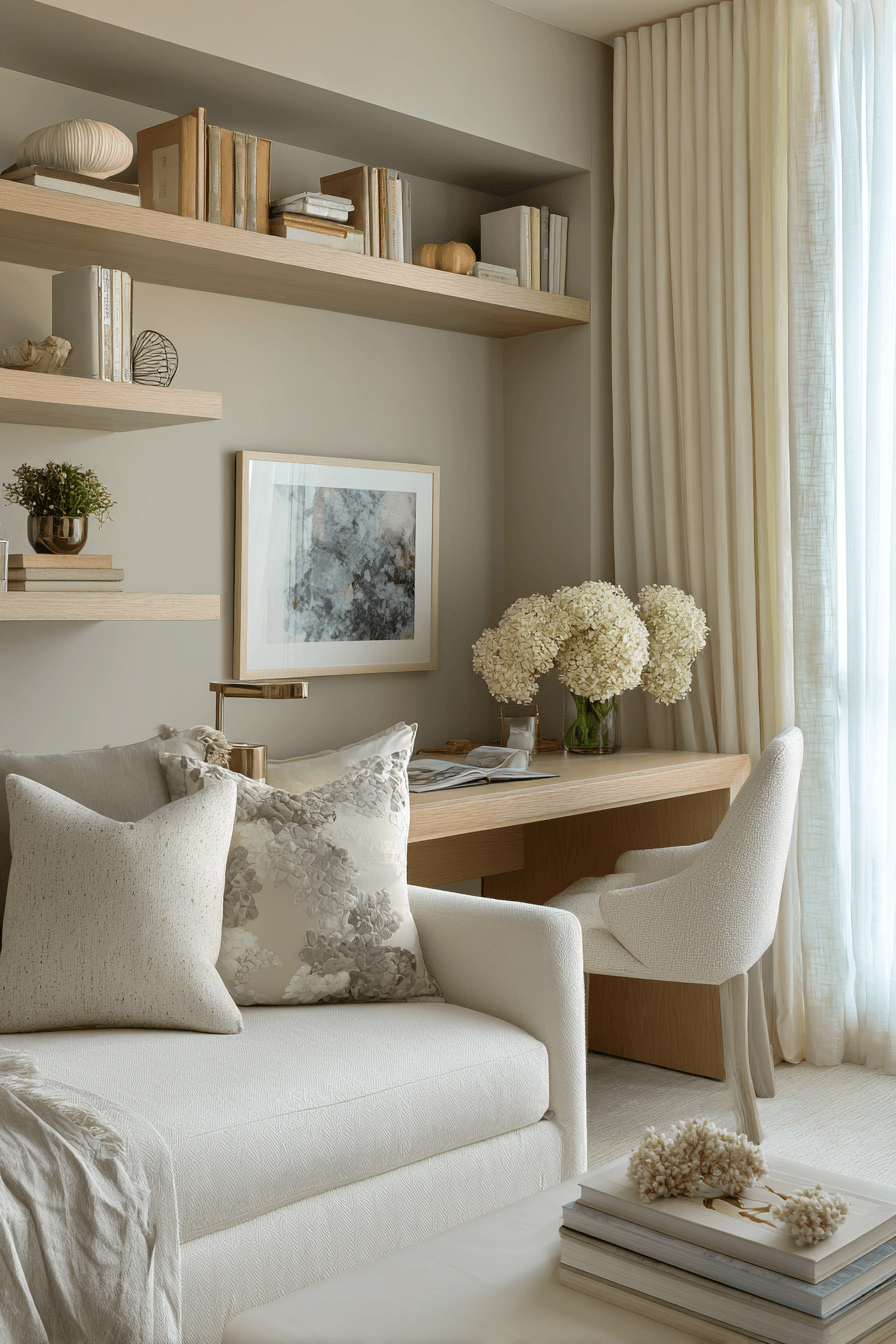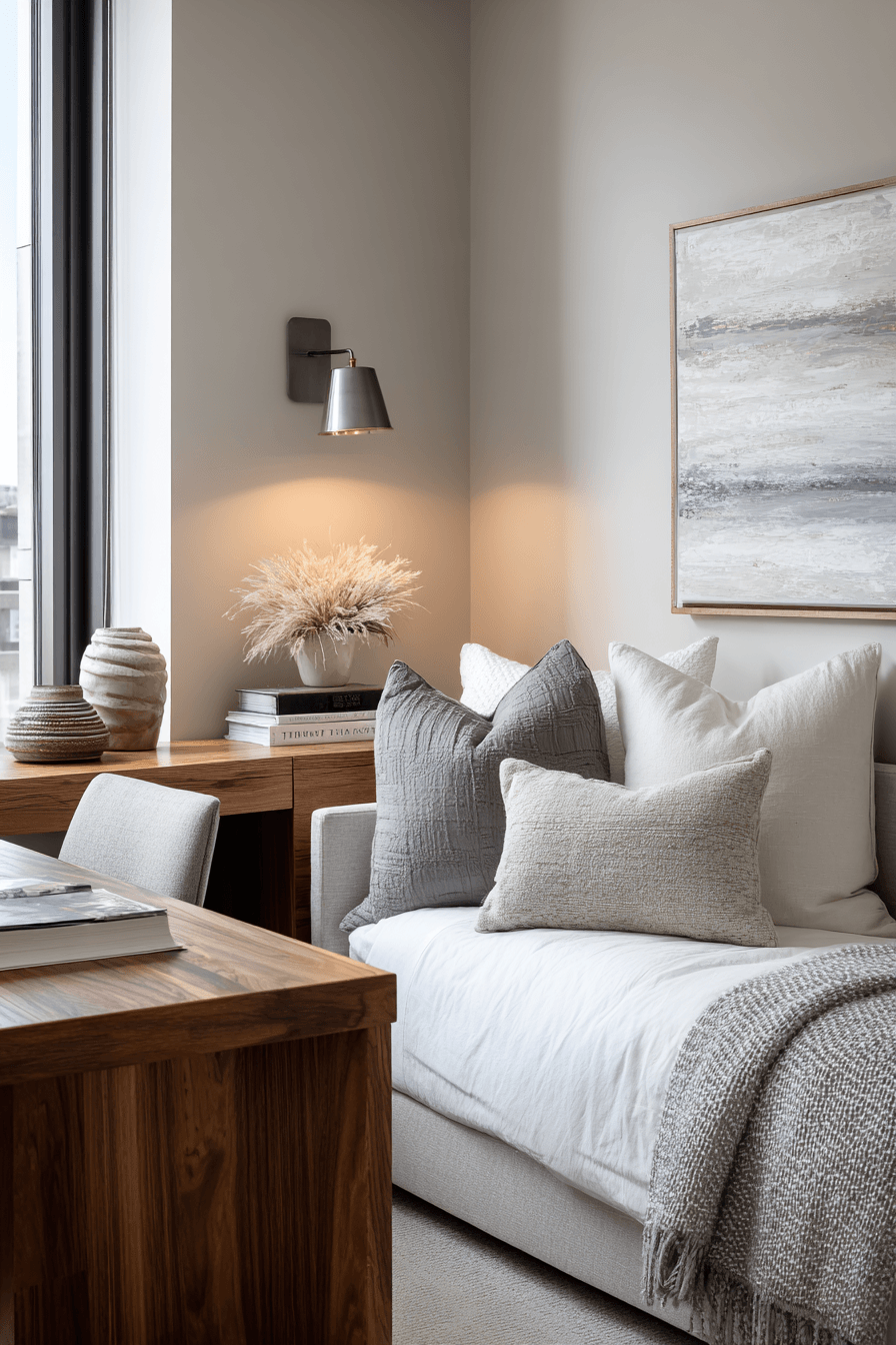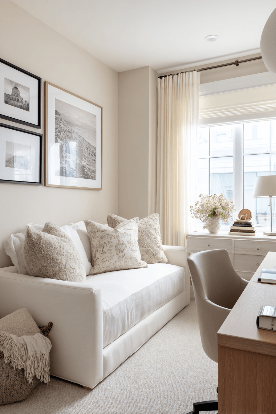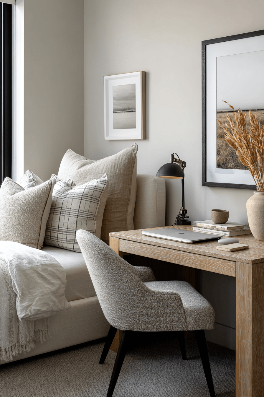 A small home office guest room designed as a dual-purpose haven blends productivity and comfort in the most seamless way. Clean-lined furniture paired with a cozy bed or sofa bed creates a balanced layout that feels intentional rather than crowded. Soft neutral tones combined with warm wood finishes and subtle metallic accents elevate the overall aesthetic. Layered lighting—from task lamps to ambient glow—ensures both work efficiency and restful evenings. Textured fabrics and minimal decor keep the space visually calm while still feeling styled and welcoming. Click to unlock more smart dual-purpose room ideas!