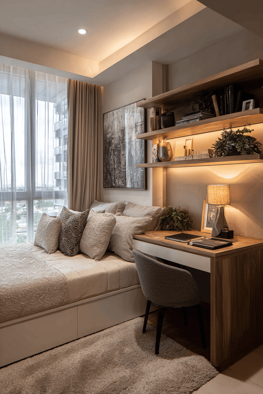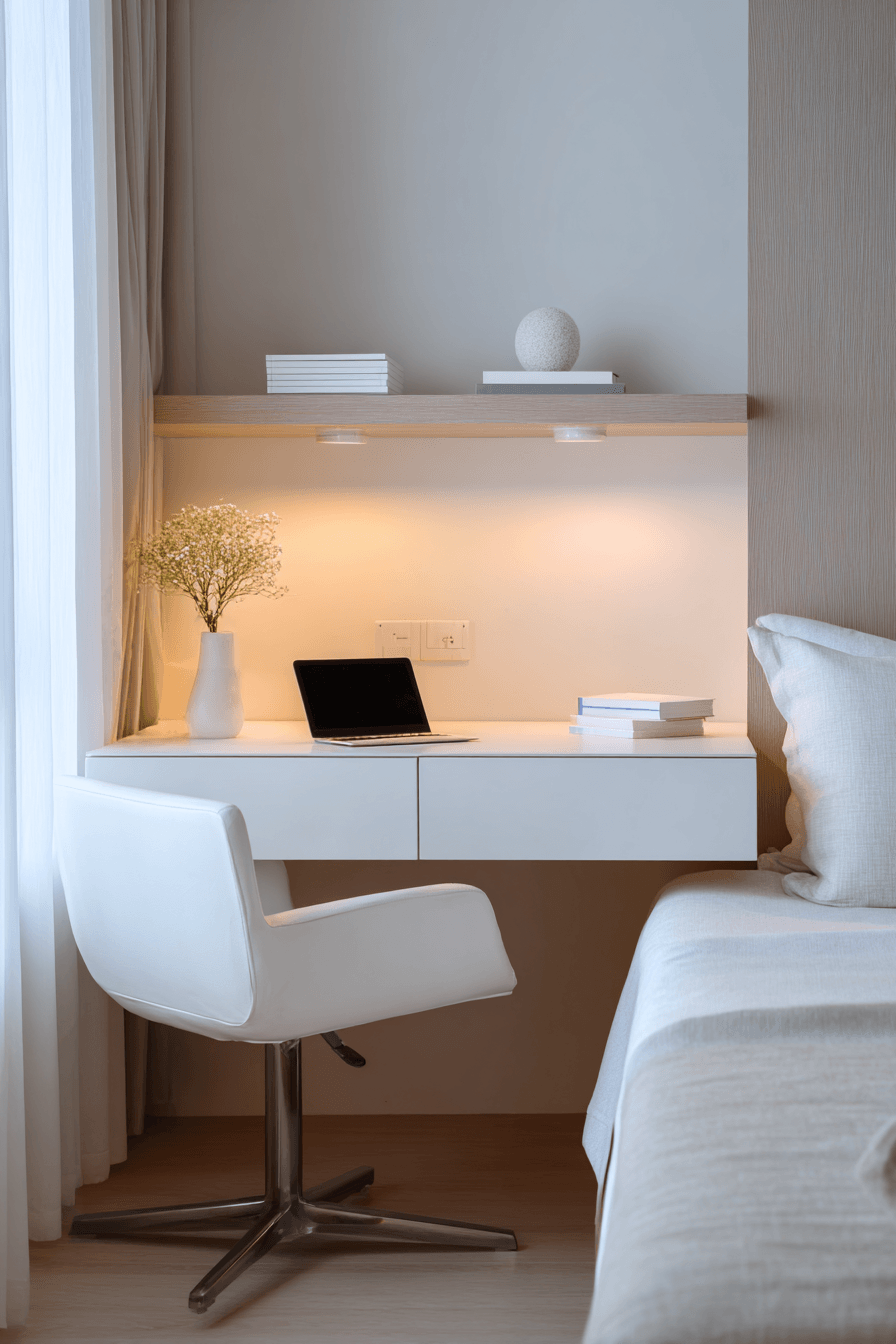 This small home office guest room becomes a streamlined work chamber with clean lines and a polished aesthetic. A compact desk setup paired with minimal decor keeps the space uncluttered and efficient. Soft lighting and neutral tones enhance the calm, professional atmosphere. The sleeping area blends seamlessly into the design without disrupting functionality. Every detail works together to create a cohesive and stylish environment. Explore more streamlined room ideas today!