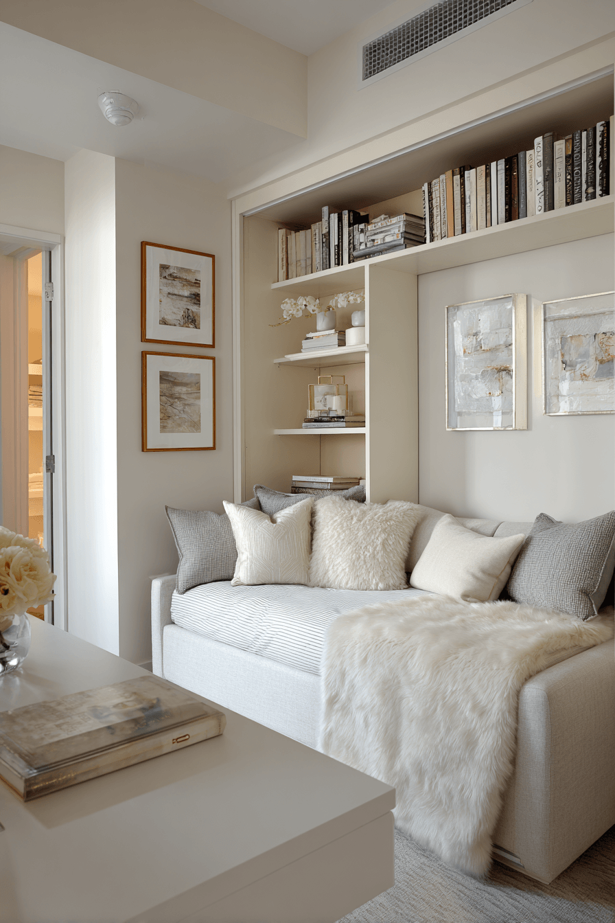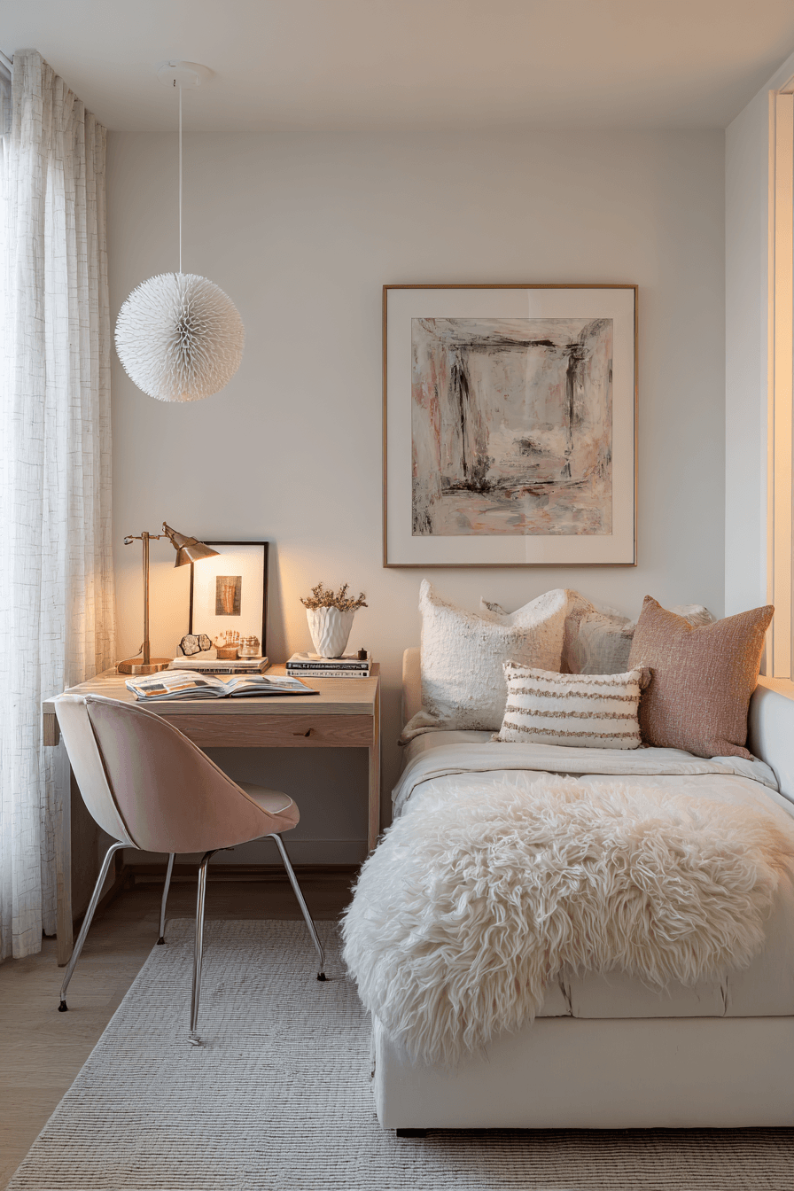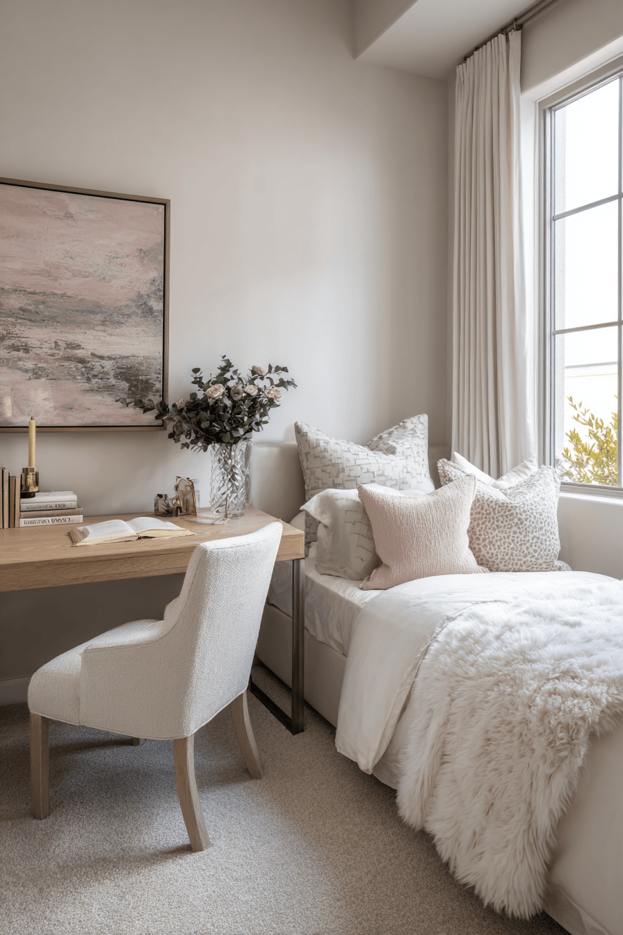 A chic multipurpose corner design brings elegance and versatility to a small home office guest room. Soft textures, subtle patterns, and carefully chosen decor elevate the overall look. A compact workspace sits effortlessly alongside a cozy sleeping area. The palette remains light and cohesive, helping the room feel open and inviting. The result is a space that feels stylish yet highly practical. Click to find more chic multipurpose inspiration!