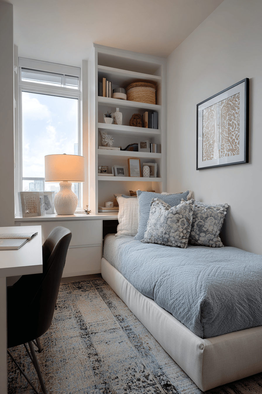 This small home office guest room shines as an organized rest studio that balances structure with comfort. Built-in storage and smart shelving keep everything neatly arranged. Soft fabrics and calming colors create a peaceful sleeping environment. The workspace is clean and efficient, promoting productivity without distraction. The overall mood is tidy, modern, and welcoming. Tap to see more organized small-room ideas!