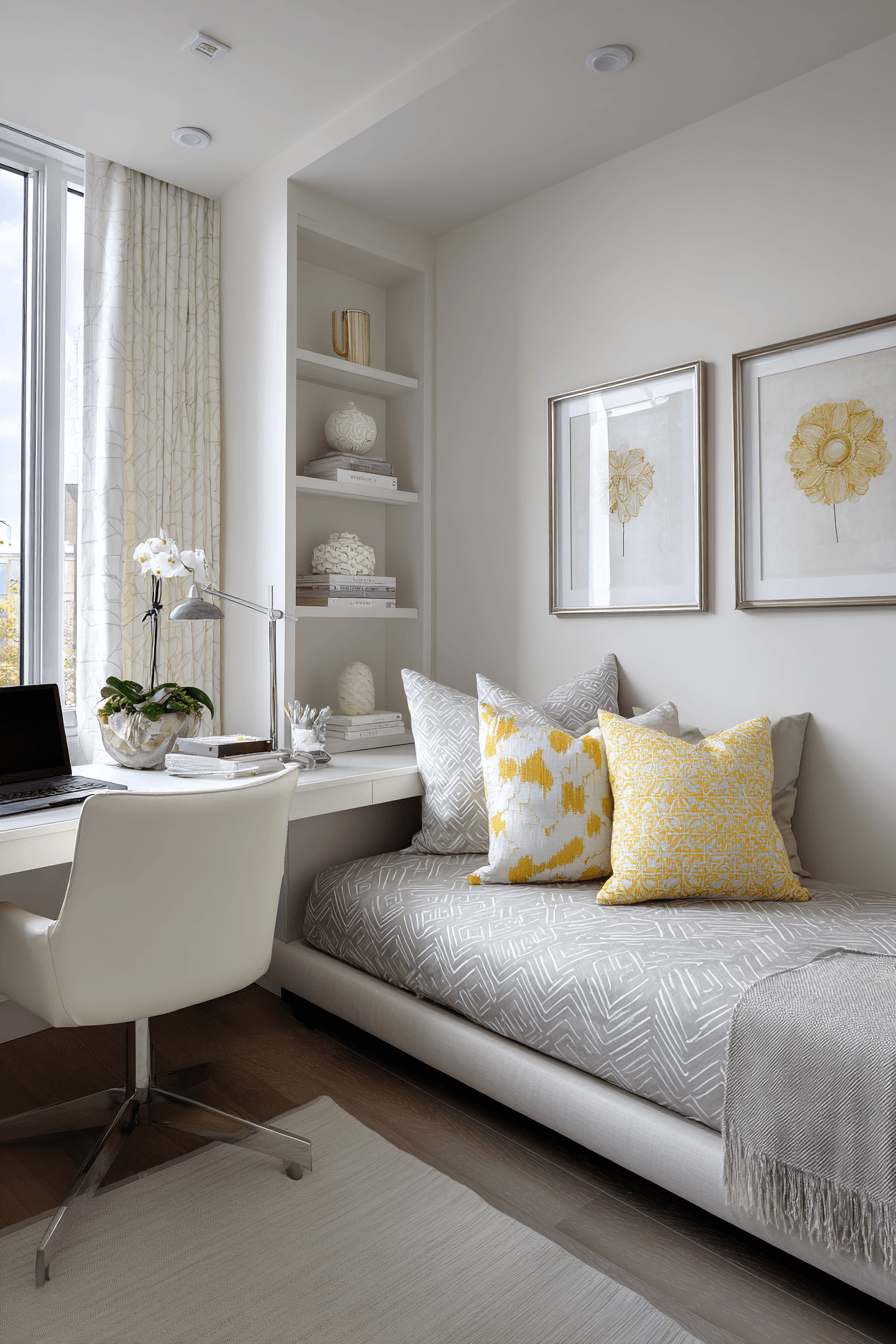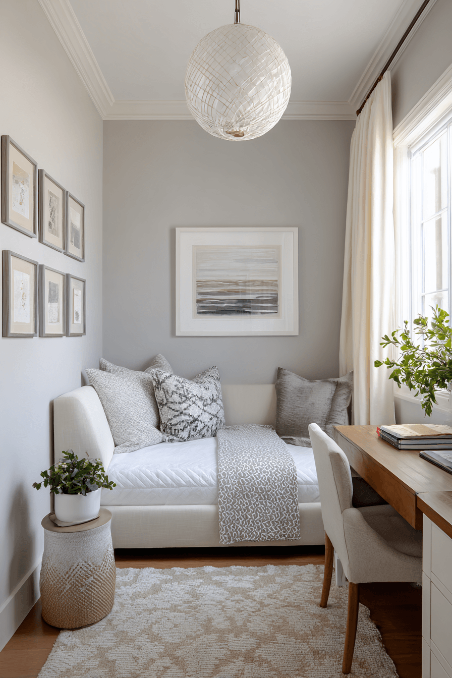 A refined dual space approach elevates a small home office guest room with a sophisticated, polished look. Elegant finishes, soft fabrics, and subtle decor create a cohesive aesthetic. The workspace and sleeping area blend seamlessly without competing for attention. Light tones enhance the airy feel, making the room appear larger. The overall mood is calm, stylish, and inviting. Explore more refined dual-purpose rooms now!