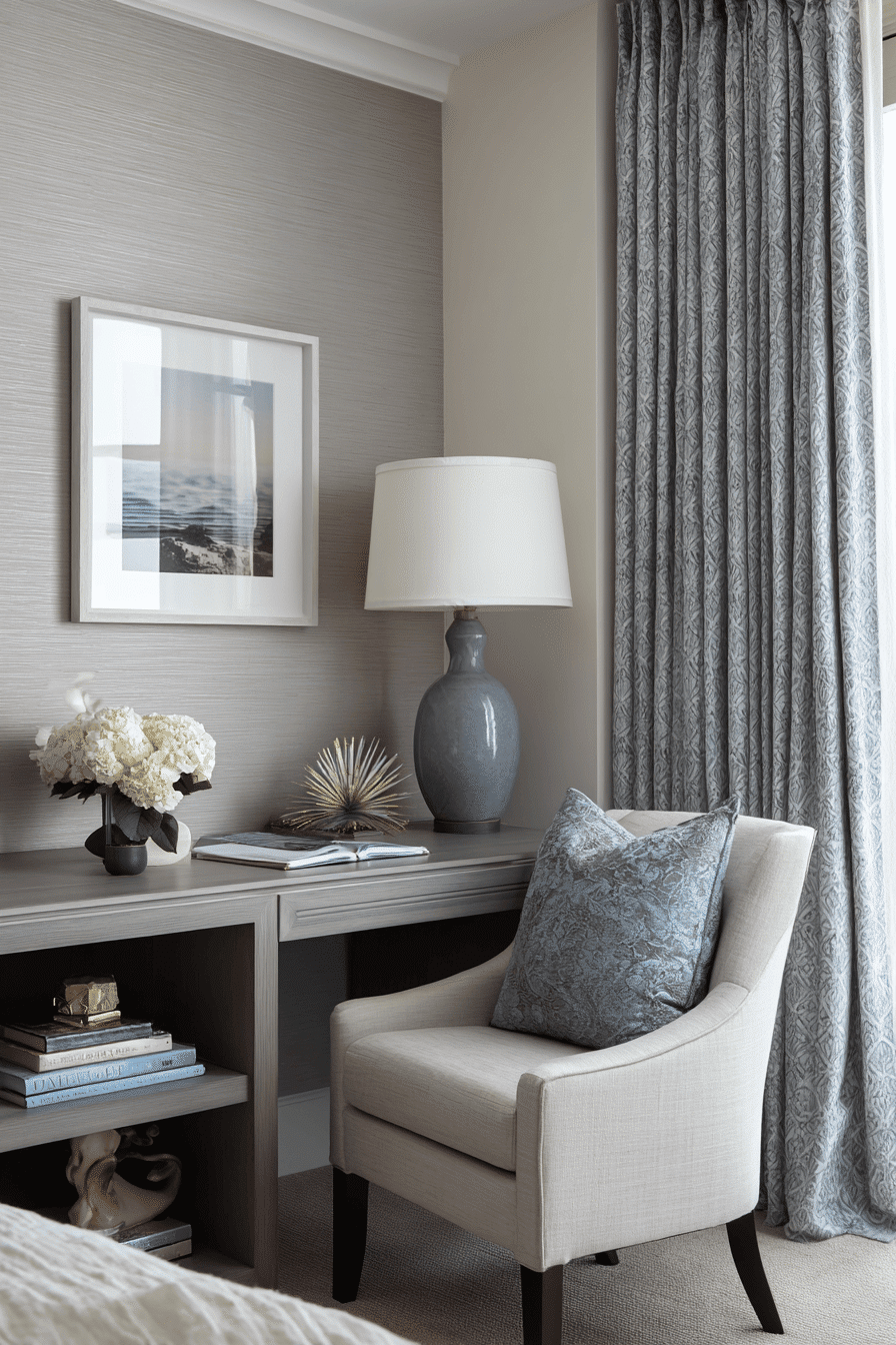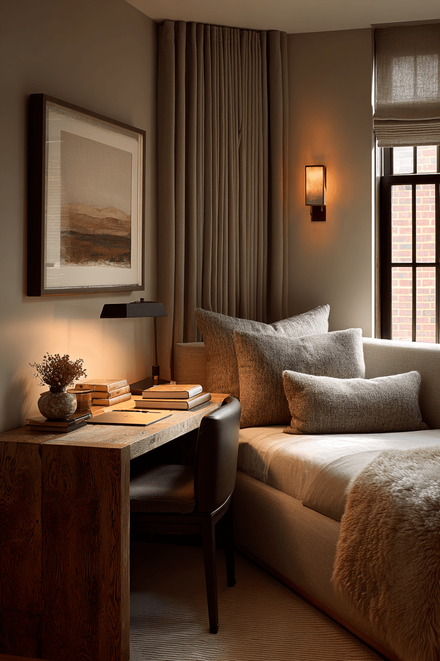 A small home office guest room styled as a cozy office nook creates an intimate, productive environment with a welcoming feel. Plush textiles, soft lighting, and warm tones make the workspace feel less rigid and more relaxing. A compact desk tucked neatly beside a comfortable guest bed ensures every inch is used efficiently. Natural materials like wood and woven accents add depth without overwhelming the design. The overall mood feels calm, functional, and effortlessly stylish. Discover how to create your own cozy workspace retreat!