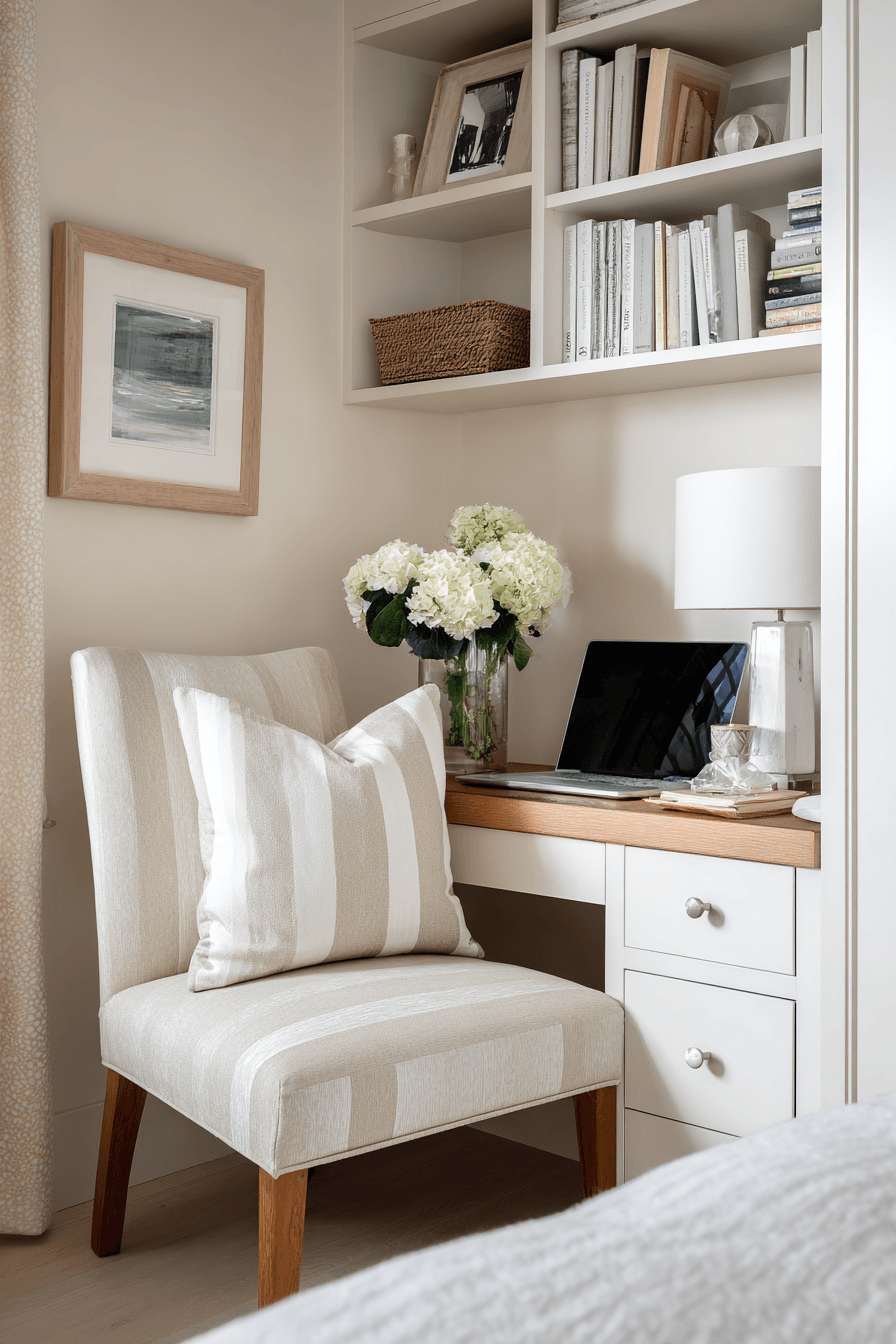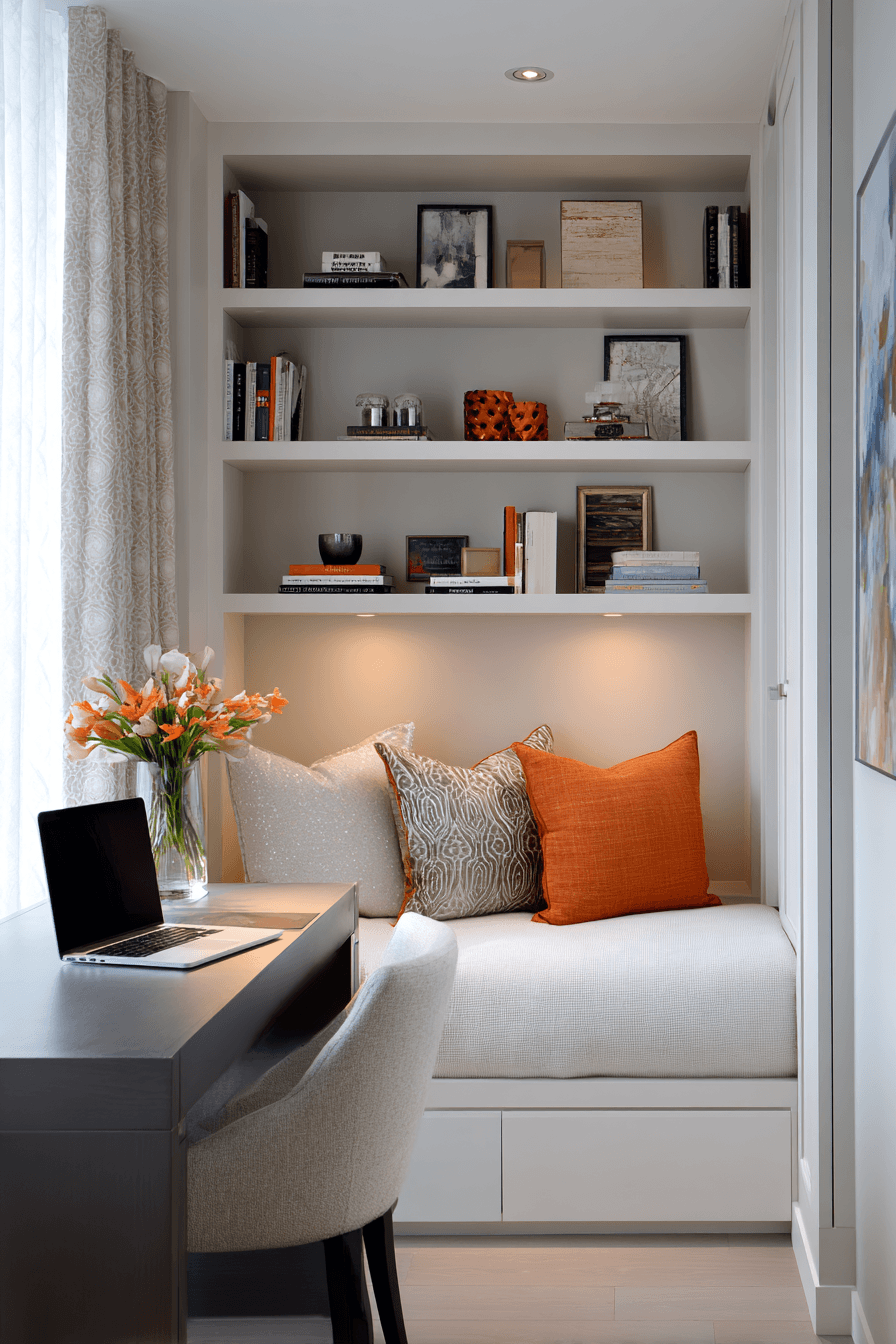 This small home office guest room excels as a smart guest workspace that prioritizes both flexibility and comfort. Sleek storage solutions and hidden compartments keep clutter out of sight, maintaining a clean and polished appearance. A neutral palette paired with soft accent colors adds visual interest without distracting from the purpose of the room. Multi-functional furniture makes transitions between work and rest smooth and intuitive. The space feels organized, modern, and welcoming for any guest. Explore more smart layout ideas now!