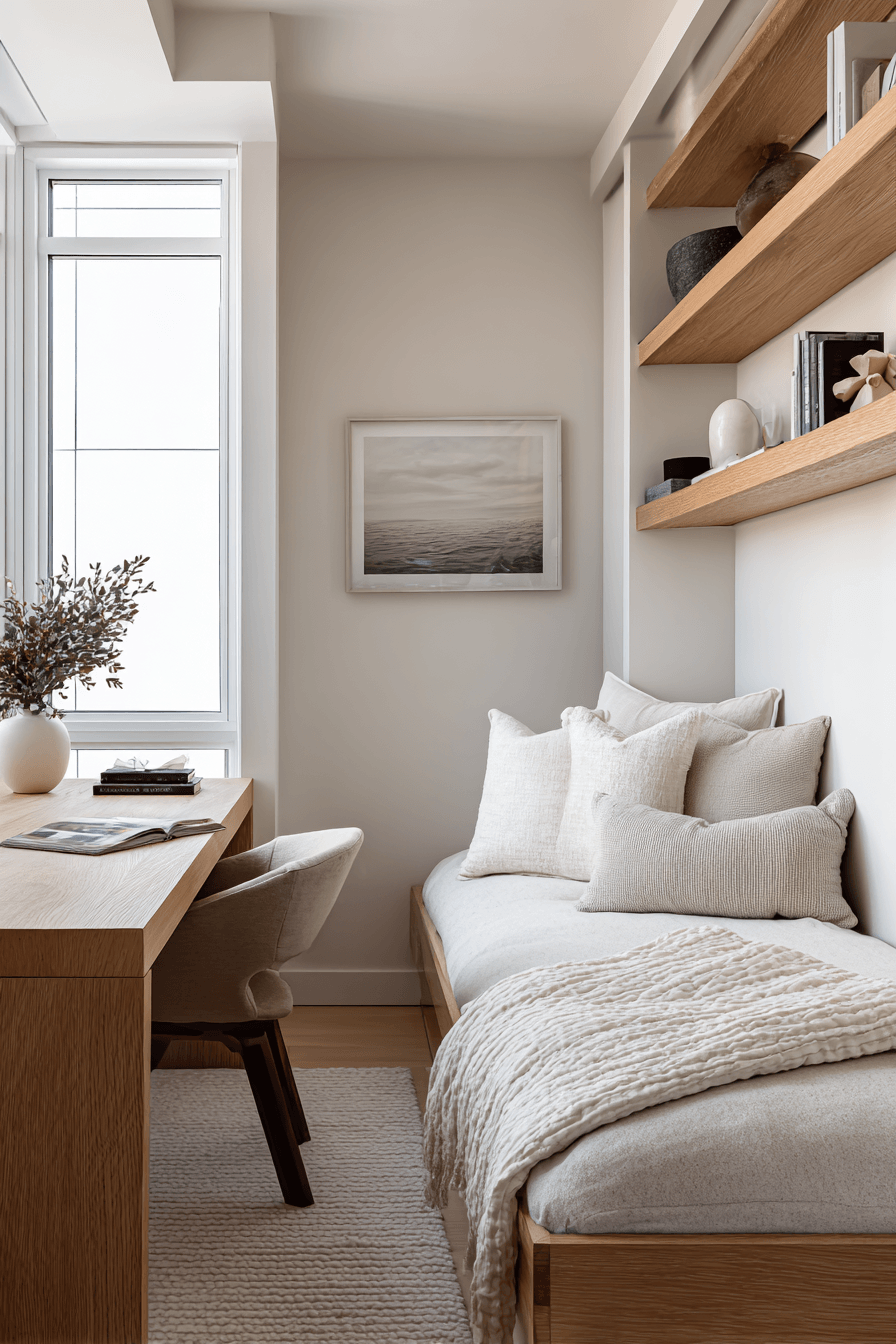 A calm work escape design turns a small home office guest room into a peaceful retreat. Soft neutral tones and gentle lighting create a relaxing atmosphere perfect for focus. A streamlined desk and cozy sleeping area keep the space functional yet inviting. Natural materials add warmth and texture without cluttering the room. The overall feel is serene, modern, and welcoming. Discover more calming workspace ideas here!