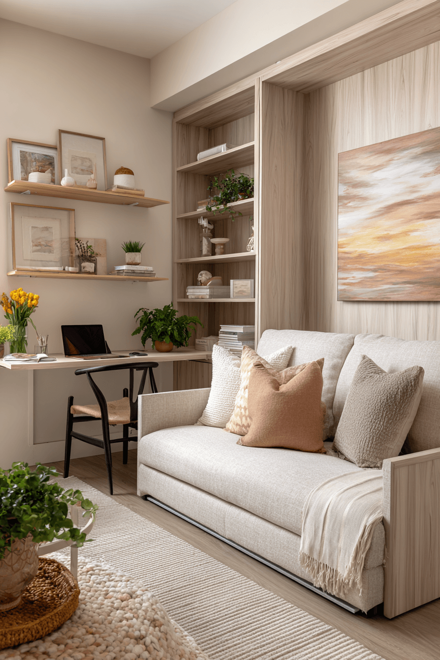 A versatile living pod concept turns a small home office guest room into a dynamic and adaptable space. Multi-functional furniture allows the room to shift easily between work and relaxation modes. Soft tones and natural textures create a cohesive and calming aesthetic. The layout feels open and thoughtfully arranged despite the limited size. Every element is designed to serve more than one purpose. Discover more versatile space ideas here!