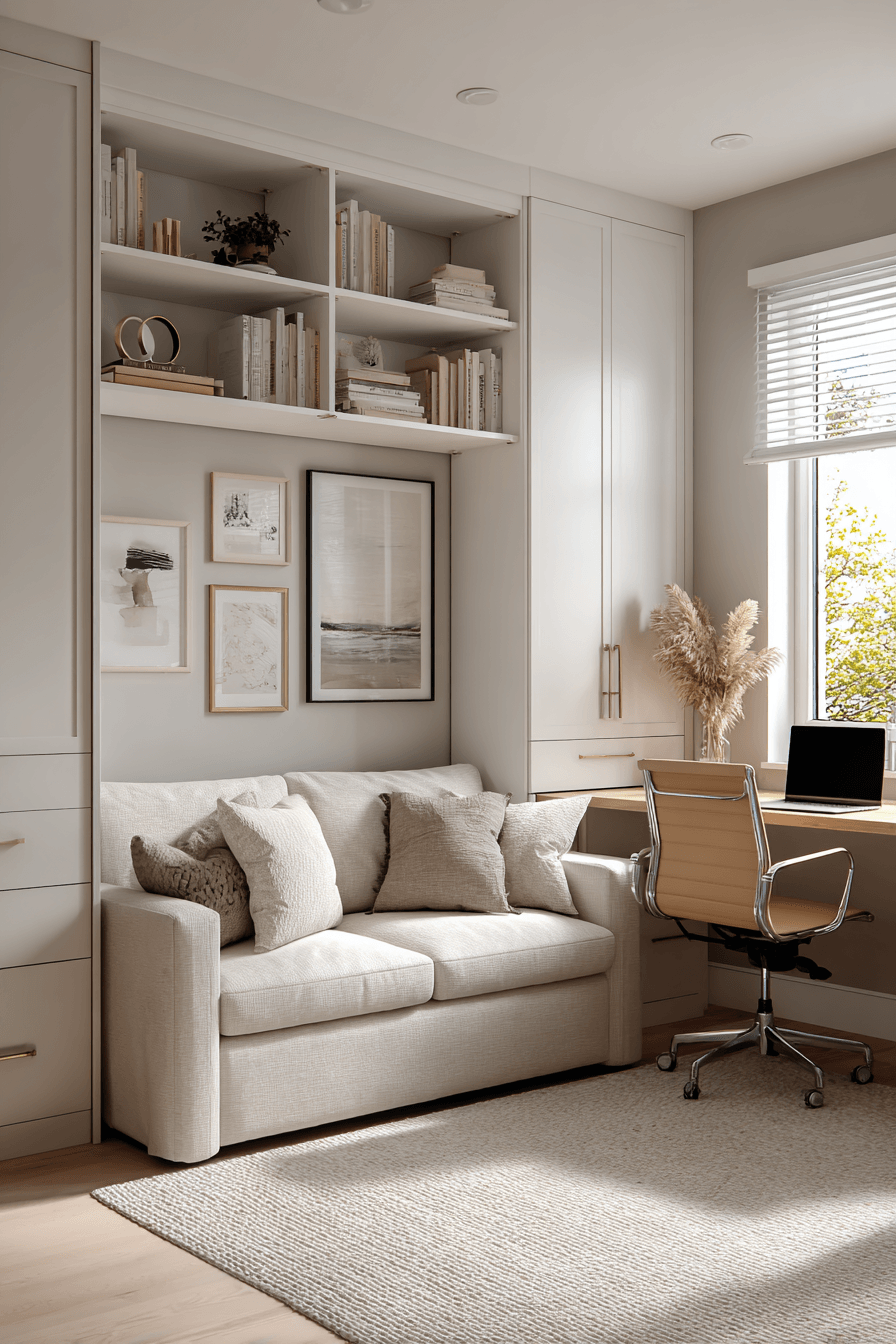 This small home office guest room works beautifully as a balanced utility room that blends practicality with comfort. A well-planned layout ensures both work and rest areas feel equally important. Neutral tones and subtle textures create a cohesive, calming design. Functional furniture keeps the space efficient without sacrificing style. The atmosphere feels organized, welcoming, and modern. Discover more balanced design ideas today!