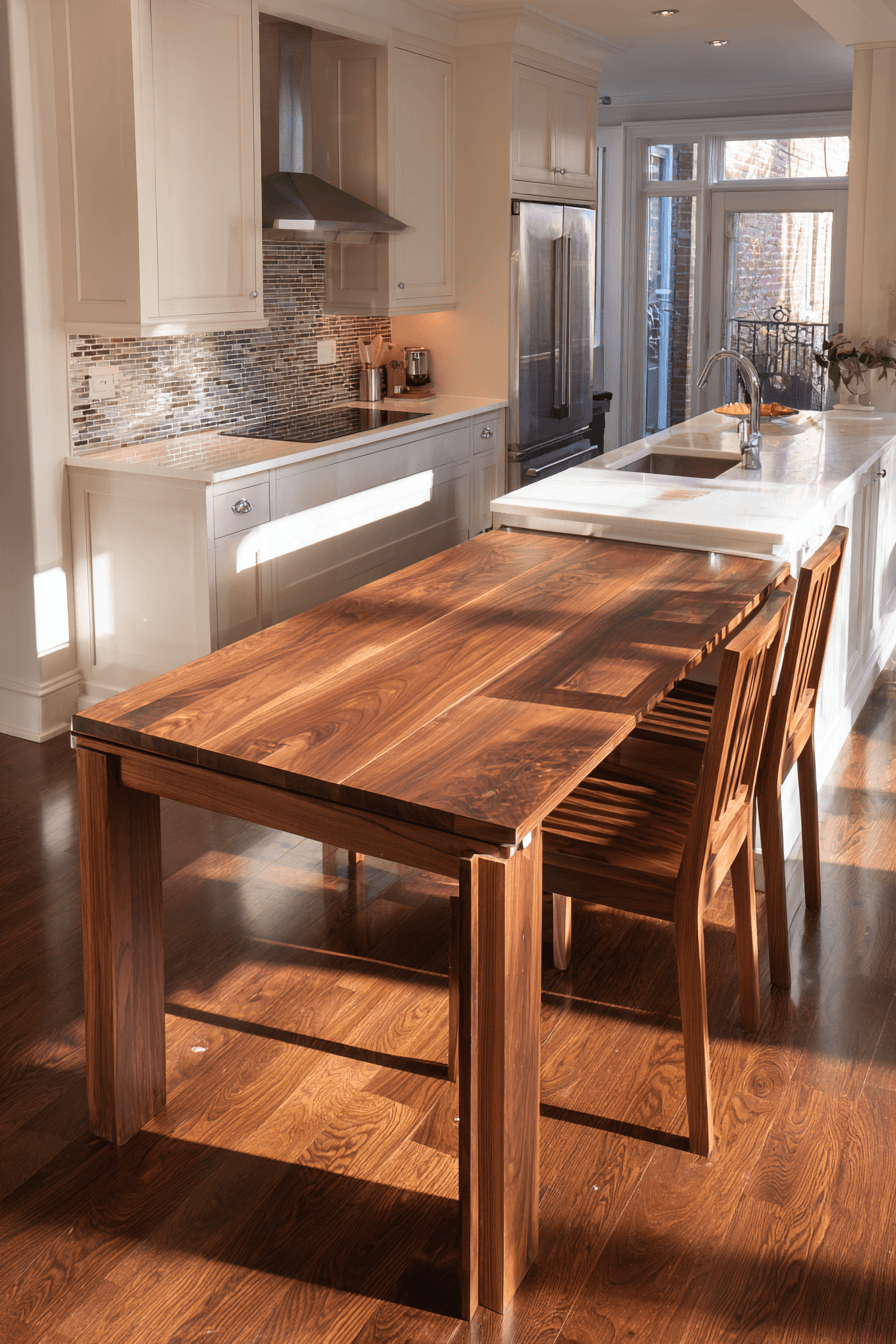 A foldable walnut table offers incredible flexibility, making it perfect for kitchens that need to adapt throughout the day. When not in use, it tucks away neatly, freeing up valuable floor space and keeping the layout open. The rich walnut tones add warmth and sophistication, even in a compact design. Small kitchen table ideas like this thrive on smart functionality without sacrificing style or visual appeal. Pairing it with foldable or stackable chairs enhances its space-saving benefits even further. The mood feels efficient, stylish, and thoughtfully designed for modern living. Click to see how folding features can maximize your layout.