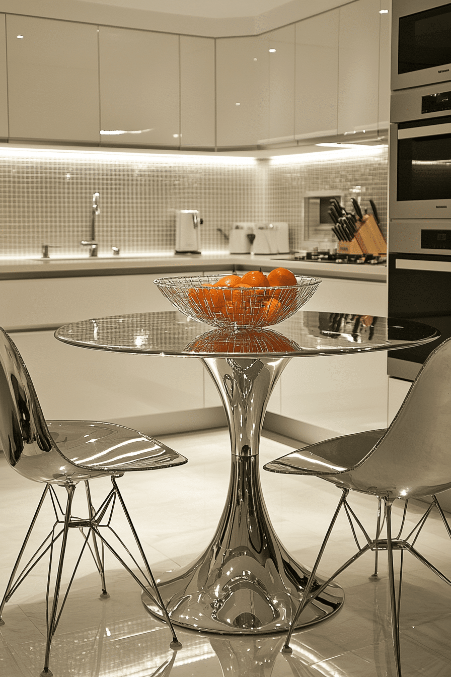 Chrome finishes bring a sleek, reflective quality that enhances both light and openness in a small kitchen. The slim structure keeps the table visually lightweight, making it easy to place without overwhelming the space. Paired with modern seating, the overall look feels polished, cohesive, and effortlessly contemporary. These small kitchen table ideas shine by combining reflective surfaces with streamlined design. Adding subtle accents like glass or neutral fabrics can soften the shine for a balanced look. The mood is bright, clean, and modern with a refined edge. Tap to add a touch of modern shine to your kitchen.