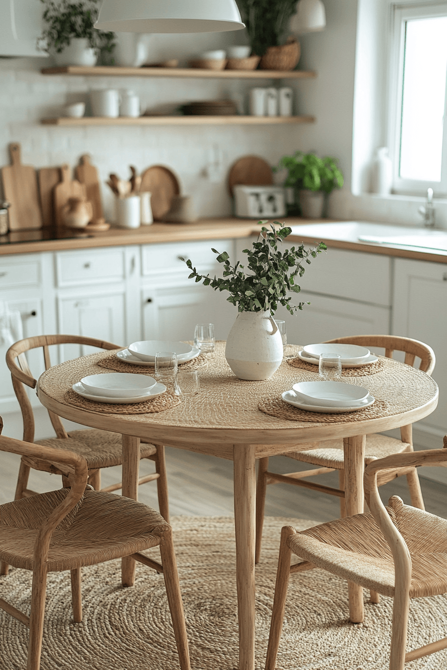 Natural rattan textures introduce a relaxed, boho-inspired vibe into a small dining space while keeping everything light and breathable. The airy construction makes the setup easy to move and prevents the room from feeling heavy or crowded. Paired with neutral tones and soft textiles, the design feels cohesive and welcoming. Small kitchen table ideas like this work by blending casual comfort with understated elegance. Adding woven accents or light wood elements can further enhance the organic feel. The mood is warm, laid-back, and effortlessly stylish with a cozy charm. Explore this look for a breezy kitchen refresh.