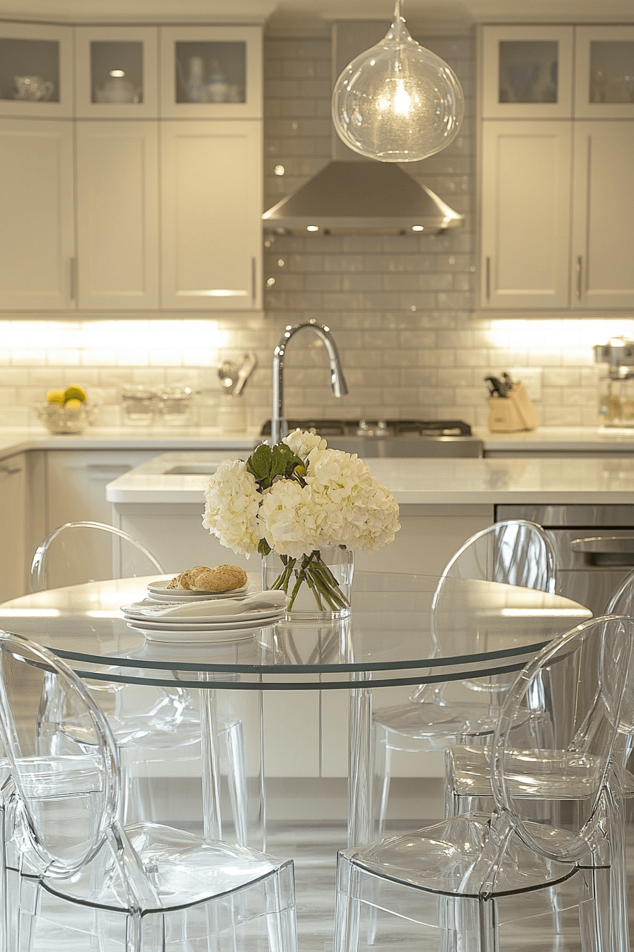 Acrylic furniture creates an almost invisible presence, making the space feel significantly larger and more open than it actually is. The curved forms and seamless edges add visual interest while keeping the design light and unobtrusive. Because the material allows light to pass through, it enhances natural brightness and prevents the room from feeling boxed in. These small kitchen table ideas are especially effective in tight layouts where visual clutter needs to be minimized. Pairing acrylic with soft neutral tones or metallic accents can elevate the overall look without adding heaviness. The mood feels modern, airy, and subtly striking with a polished finish. Click to see how transparency transforms tight areas.