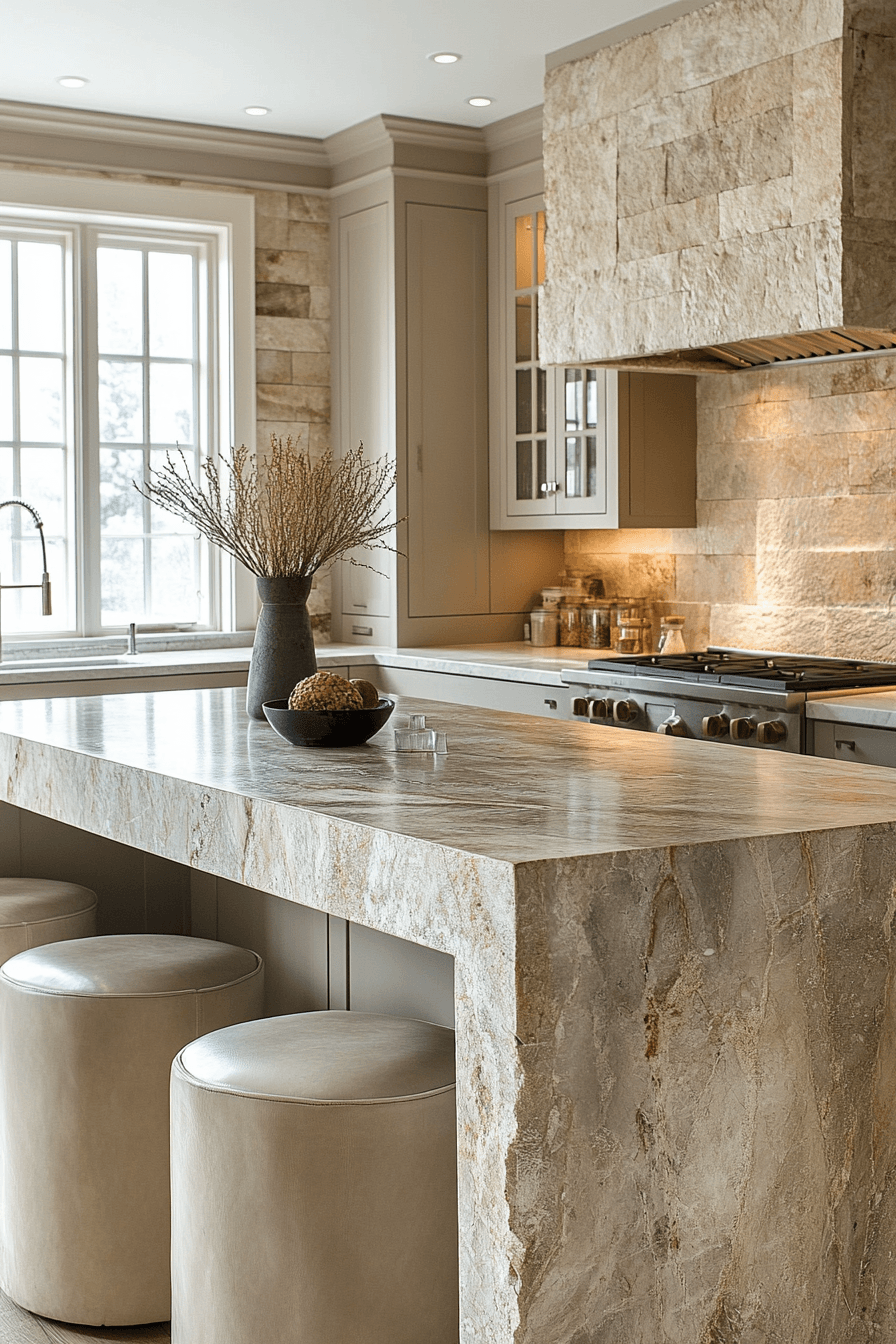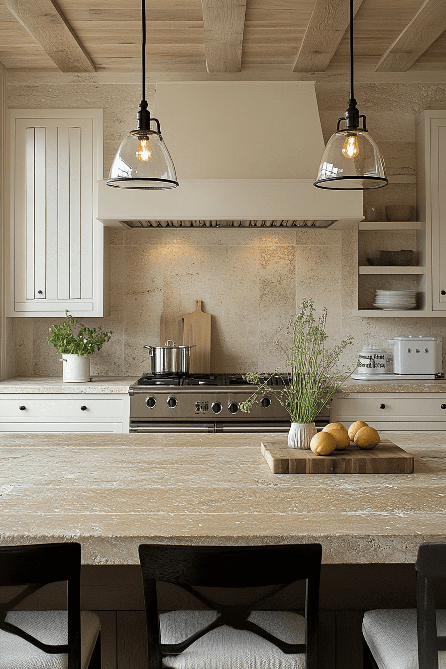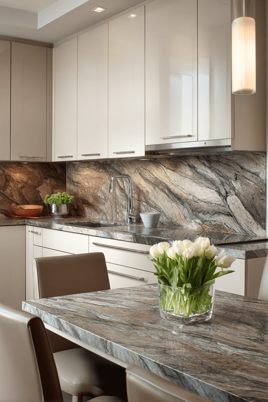 Travertine textures introduce natural elegance into a compact dining area, bringing warmth and subtle variation to the design. The soft, earthy tones create a calming atmosphere while still feeling refined and upscale. Its gentle patterning adds interest without overwhelming the space visually. These small kitchen table ideas work by combining organic materials with clean, simple forms. Pairing travertine with neutral decor enhances its timeless appeal. The mood feels serene, sophisticated, and effortlessly stylish. Click to bring natural textures into your kitchen.