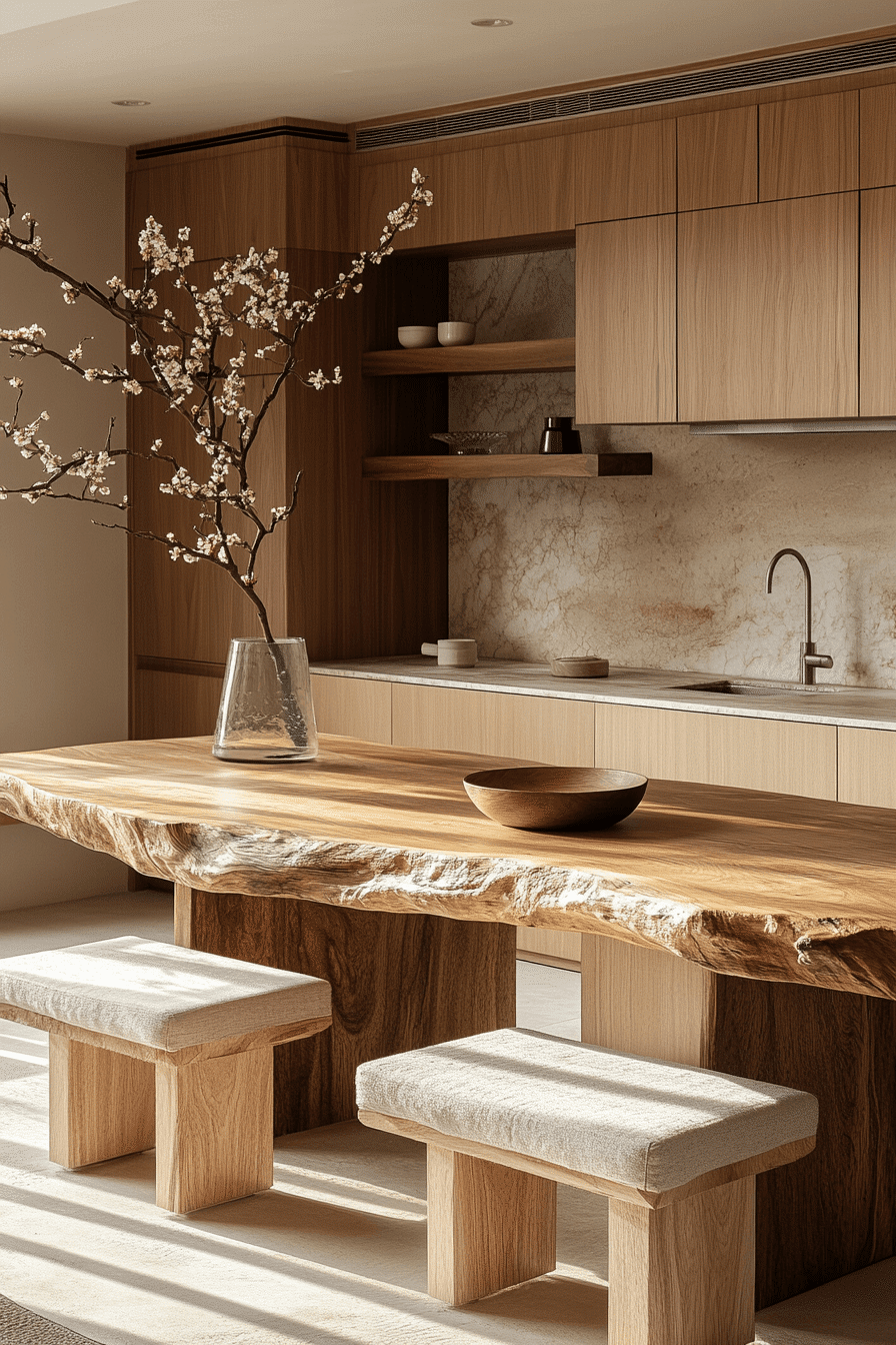 Cedar wood tones paired with minimalist design create a calming Japandi-inspired look that feels both warm and intentional. The table’s clean lines and natural grain bring subtle texture while maintaining a clutter-free appearance. Paired with simple seating and soft neutral accents, the space feels cohesive and thoughtfully curated. These small kitchen table ideas work by merging natural warmth with modern simplicity. Incorporating soft lighting or light textiles can enhance the peaceful ambiance even further. The mood is serene, modern, and perfectly balanced for everyday comfort. Explore this style for a calming kitchen atmosphere.