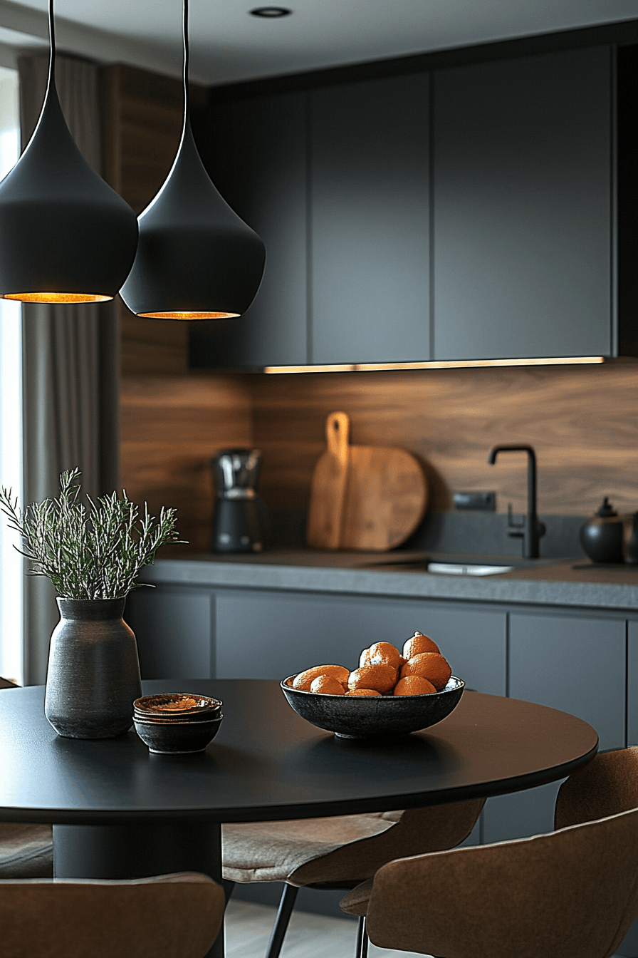 A matte black table adds bold contrast while maintaining a sleek, modern silhouette that instantly anchors the room. The finish absorbs light, creating depth and dimension without overwhelming the overall layout. When paired with lighter cabinetry or walls, it becomes a striking focal point that draws the eye naturally. Small kitchen table ideas like this thrive on contrast, using darker tones to define the space without adding bulk. Adding metallic accents or soft textures can soften the look and create visual balance. The mood feels confident, stylish, and effortlessly contemporary. Click to make a bold statement in your kitchen.