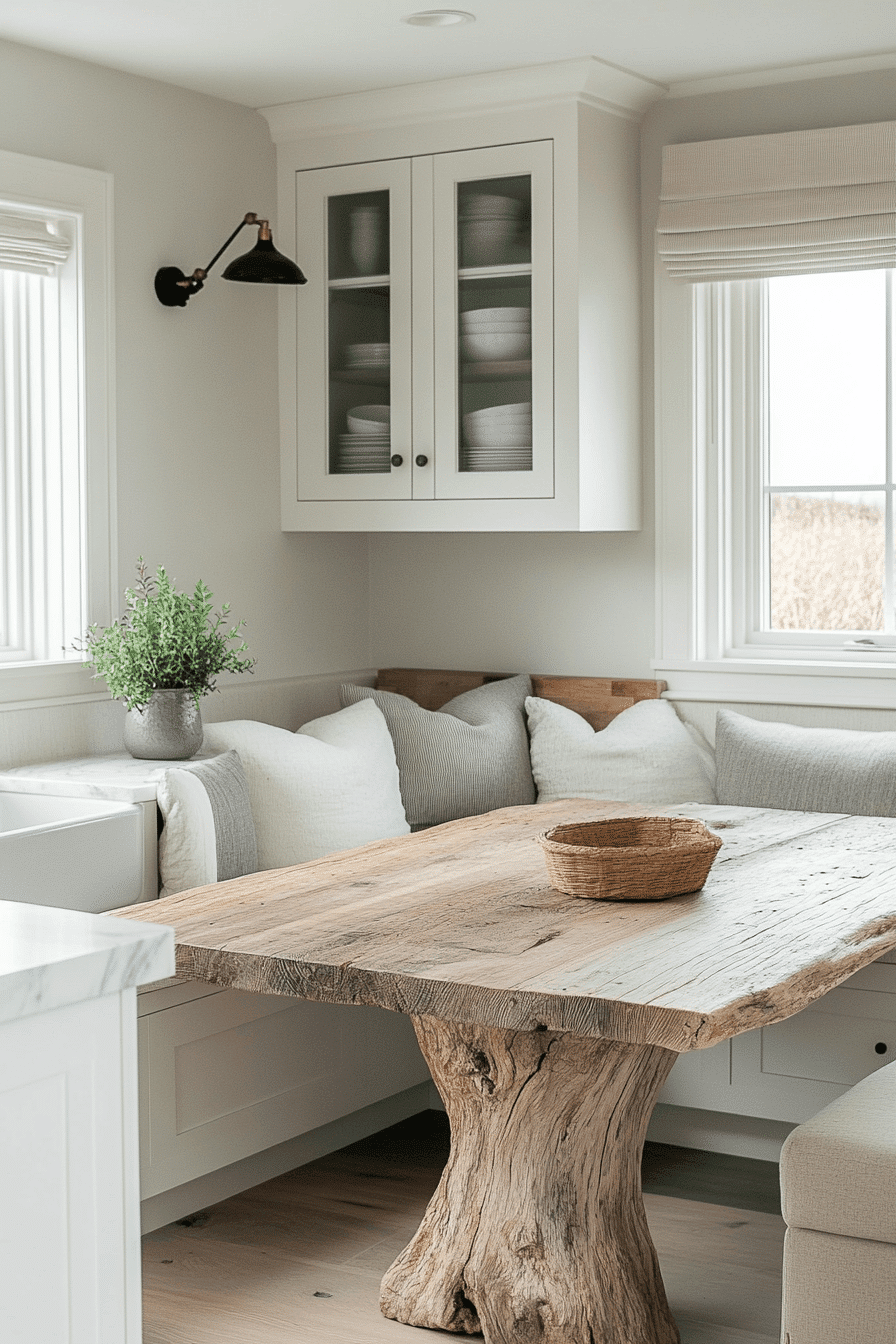 Driftwood tones bring a coastal softness into a small dining area, creating a relaxed and breezy atmosphere that feels instantly welcoming. The weathered finish keeps the space feeling open and light while adding subtle texture and character. Paired with simple seating and soft, neutral accents, the design remains cohesive and easy to style. These small kitchen table ideas work by introducing natural texture without adding visual heaviness. Light fabrics and airy lighting can enhance the beach-inspired aesthetic even further. The mood is calm, fresh, and effortlessly laid-back. Tap to bring coastal charm into your kitchen.