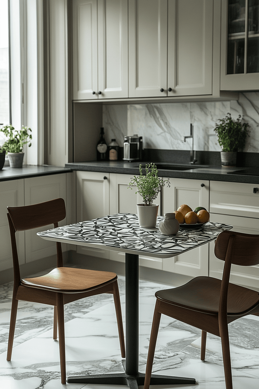 Resin surfaces with geometric patterns add a bold, modern artistic touch to compact spaces, turning the table into a true centerpiece. The intricate designs create visual interest while eliminating the need for additional decor. Clean lines and structured shapes keep the overall look balanced and cohesive. Small kitchen table ideas like this work by blending functional furniture with artistic expression. Pairing the table with minimal seating ensures the pattern remains the focal point. The mood feels creative, vibrant, and refreshingly unique. Explore this look for a standout kitchen centerpiece.