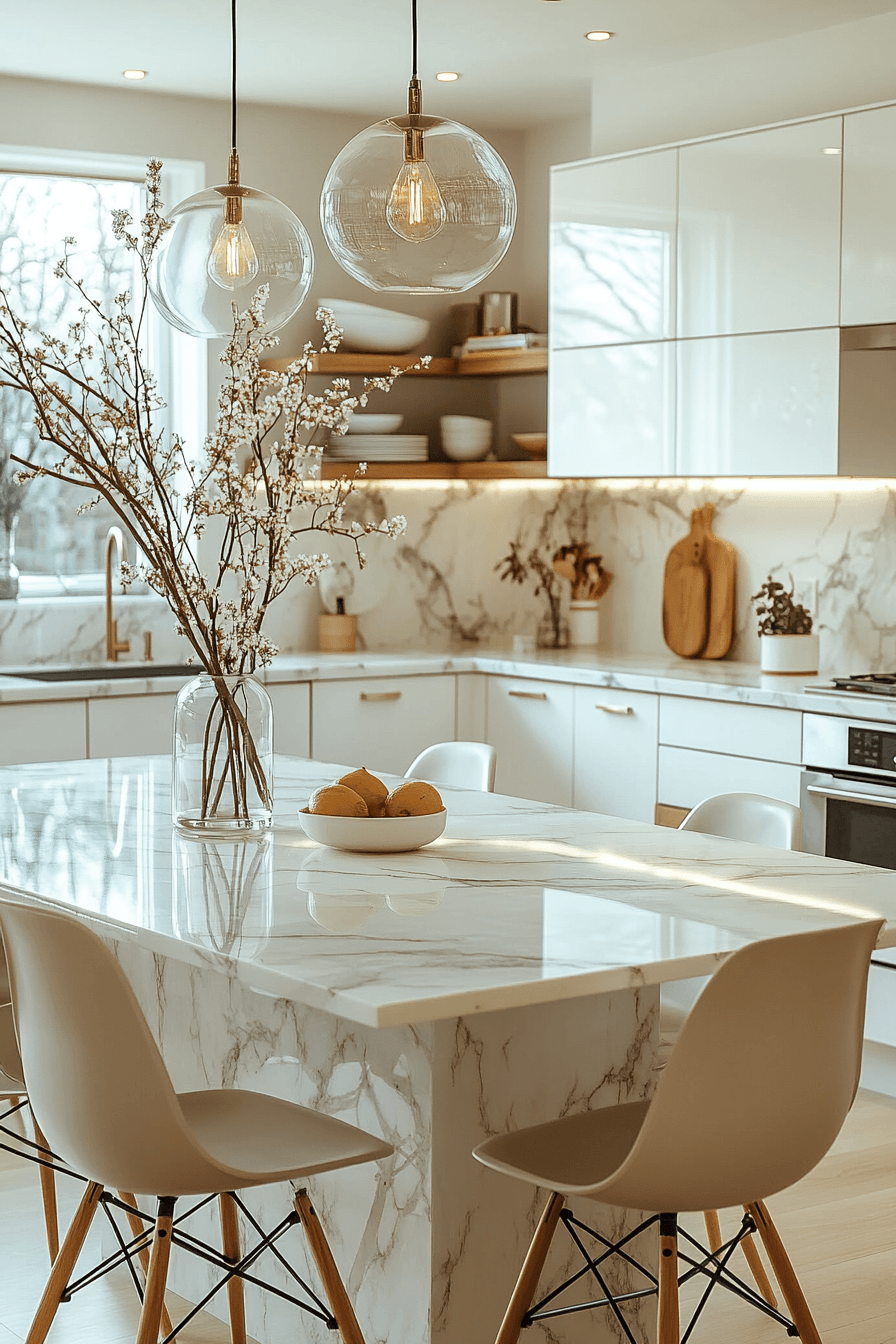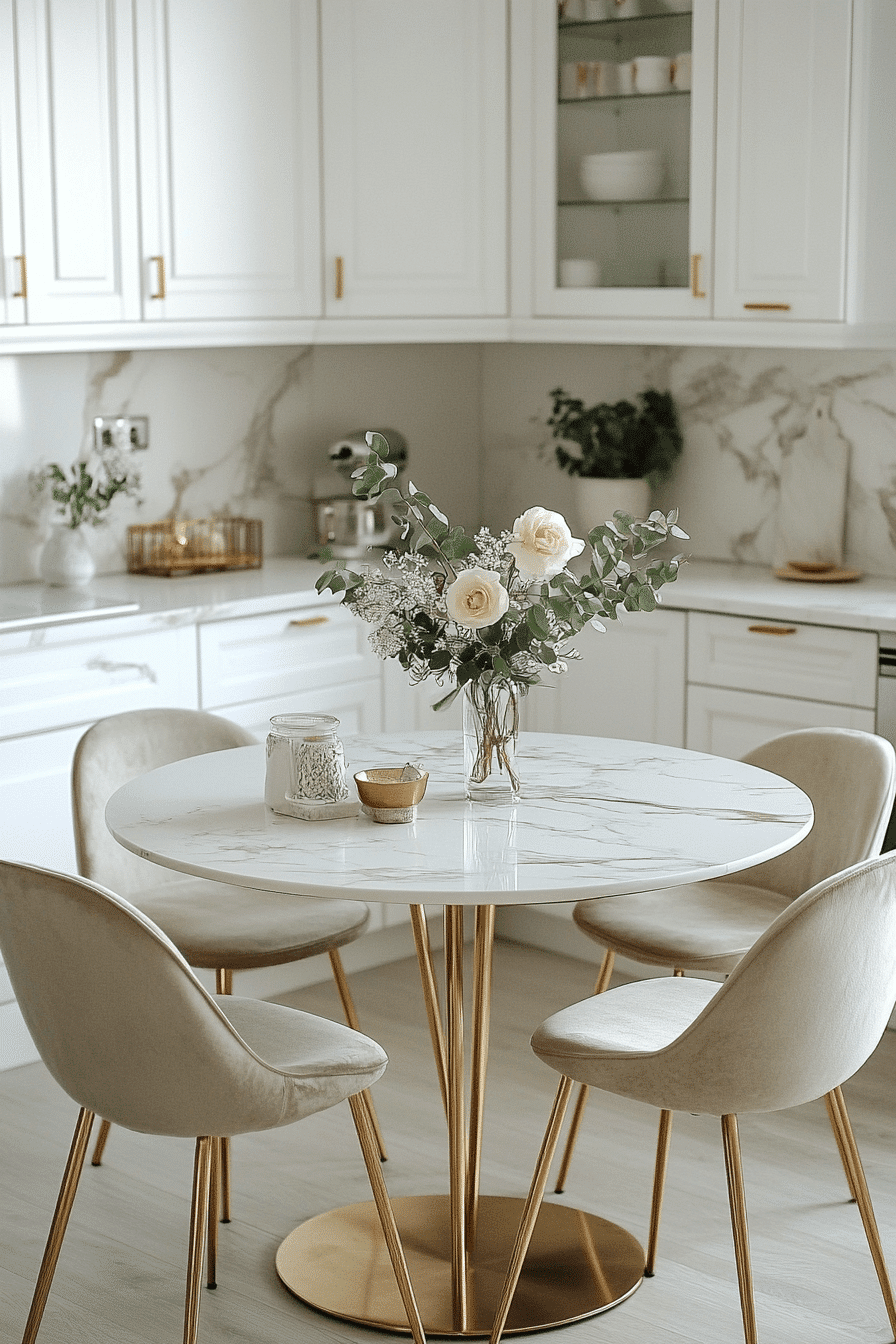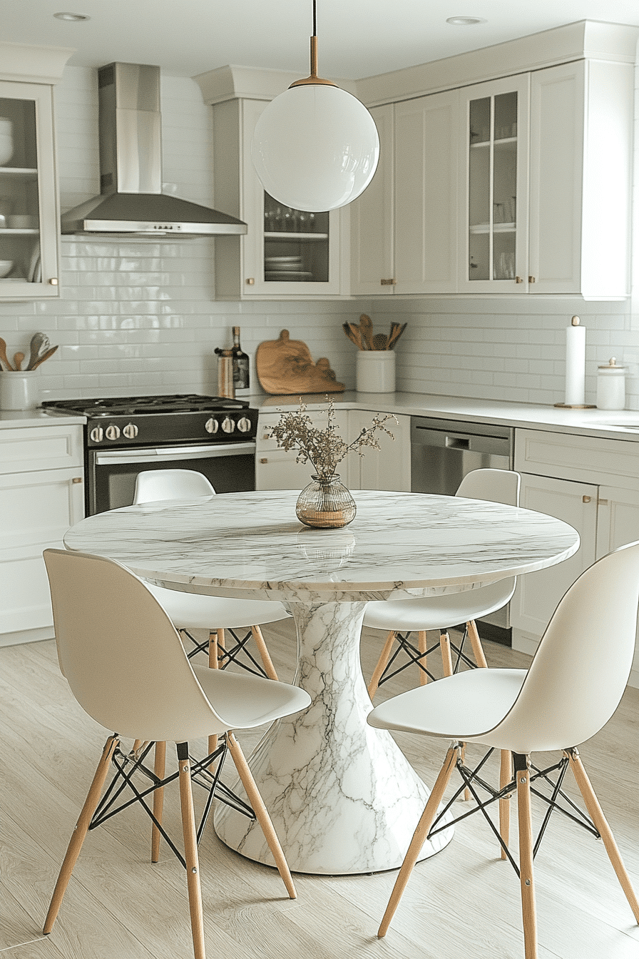 A smooth marble pedestal table creates a sculptural focal point while keeping the base visually open and airy, allowing light to travel freely through the space. Its rounded form makes movement around the kitchen effortless, especially in tighter layouts where sharp corners can feel restrictive. Soft veining in the marble adds organic detail without overwhelming the design, giving the table a timeless, high-end look. With small kitchen table ideas like this, the single pedestal base maximizes legroom and makes seating more flexible for different arrangements. Pairing it with light-toned chairs or acrylic seating enhances the airy feel even more. The overall atmosphere feels fresh, bright, and effortlessly elegant with a refined edge. Tap to see how this timeless look transforms small spaces.