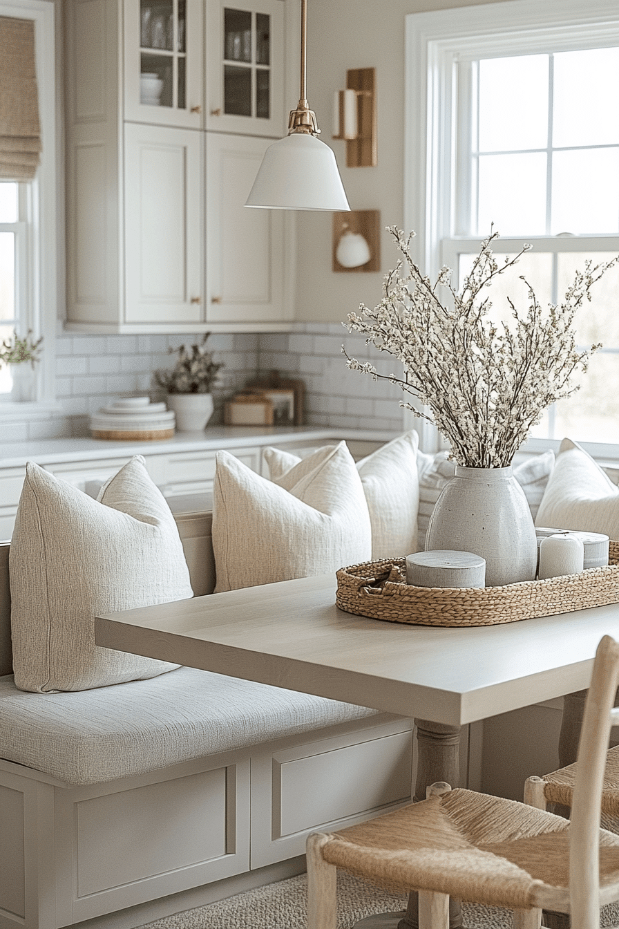 Soft linen textures paired with a compact table create a cozy, welcoming dining spot that feels both relaxed and refined. The gentle fabric elements add warmth and softness without taking over the space visually. Neutral tones keep everything cohesive, making it easy to layer with other subtle decor elements. Small kitchen table ideas like this work by focusing on comfort while maintaining a clean and uncluttered layout. Adding cushions or light drapery can enhance the cozy atmosphere even further. The mood feels calm, soft, and effortlessly inviting. Tap to create a cozy kitchen corner.