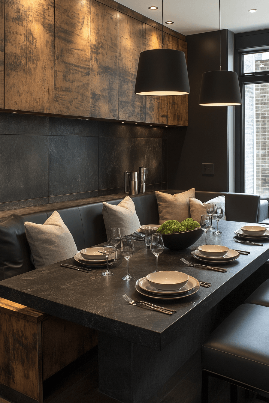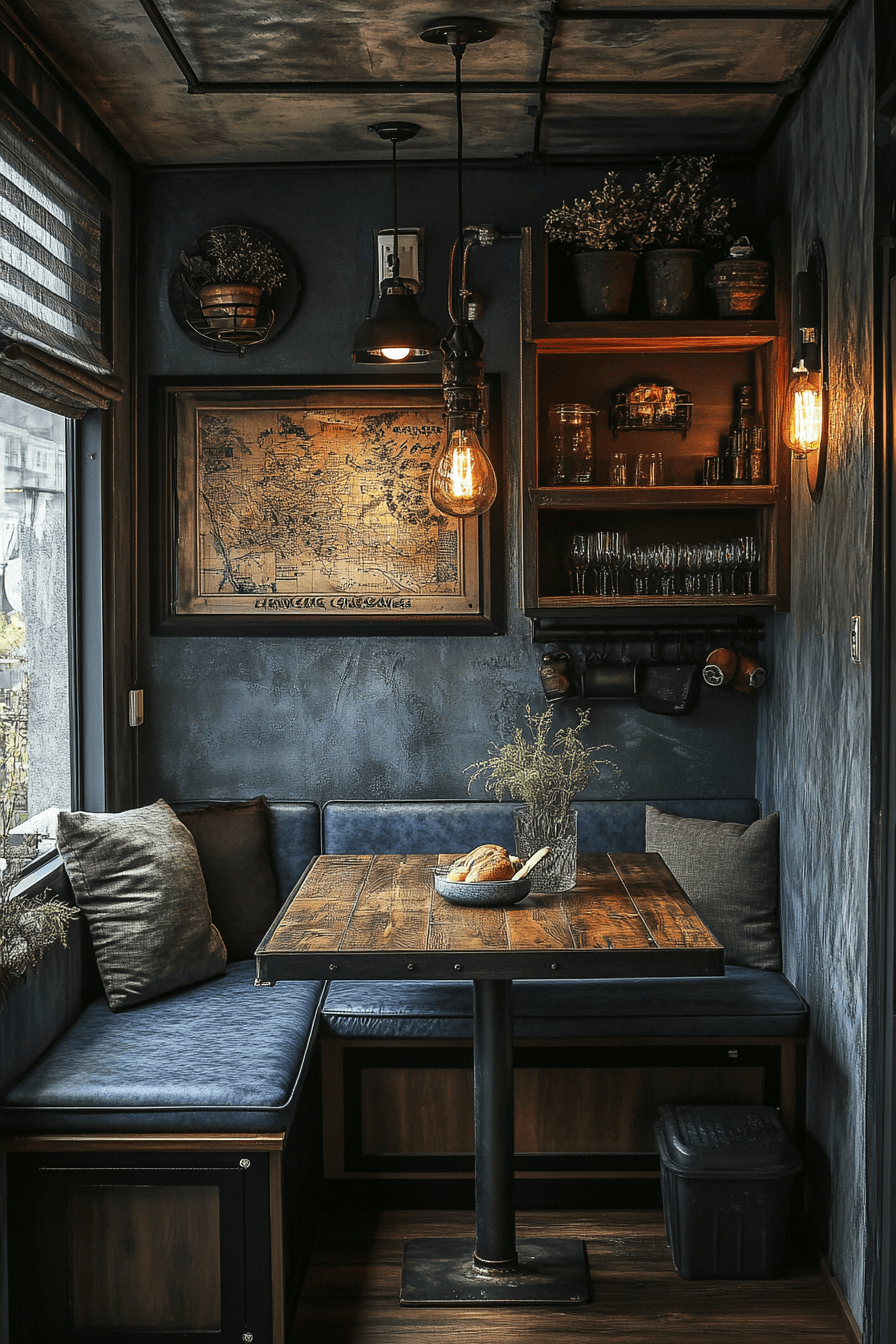 This setup brings a rich velvet texture into a compact dining nook, instantly elevating the visual warmth of the space while adding a soft, tactile layer that feels luxurious yet approachable. A slim, rounded table paired with plush upholstered seating keeps the footprint minimal while creating a comfortable spot that invites you to linger longer. The color palette leans into deep, moody tones like charcoal, navy, or emerald, which contrast beautifully with lighter walls and subtle metallic accents for added depth. These small kitchen table ideas work because they balance upscale materials with thoughtful proportions, ensuring the space never feels crowded. Strategic lighting, like a warm pendant or wall sconce, enhances the cozy glow and highlights the textures. The mood feels intimate, polished, and perfect for slow mornings or intimate dinners. Click to bring this elevated comfort into your own kitchen.
