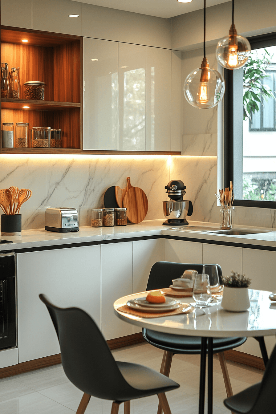 A polished quartz surface offers both durability and elegance in a compact dining space, making it a smart choice for everyday use. Its subtle reflective quality helps bounce light around the room, instantly brightening the entire kitchen. The clean edges and gentle patterning keep the design modern and uncluttered, blending effortlessly with a variety of styles. With small kitchen table ideas like this, you get a surface that’s not only beautiful but also resistant to stains and wear. Pairing it with minimalist chairs or soft neutral tones enhances the sophisticated feel. The mood is crisp, refined, and easy to maintain for busy lifestyles. Explore how quartz can elevate your everyday dining area.