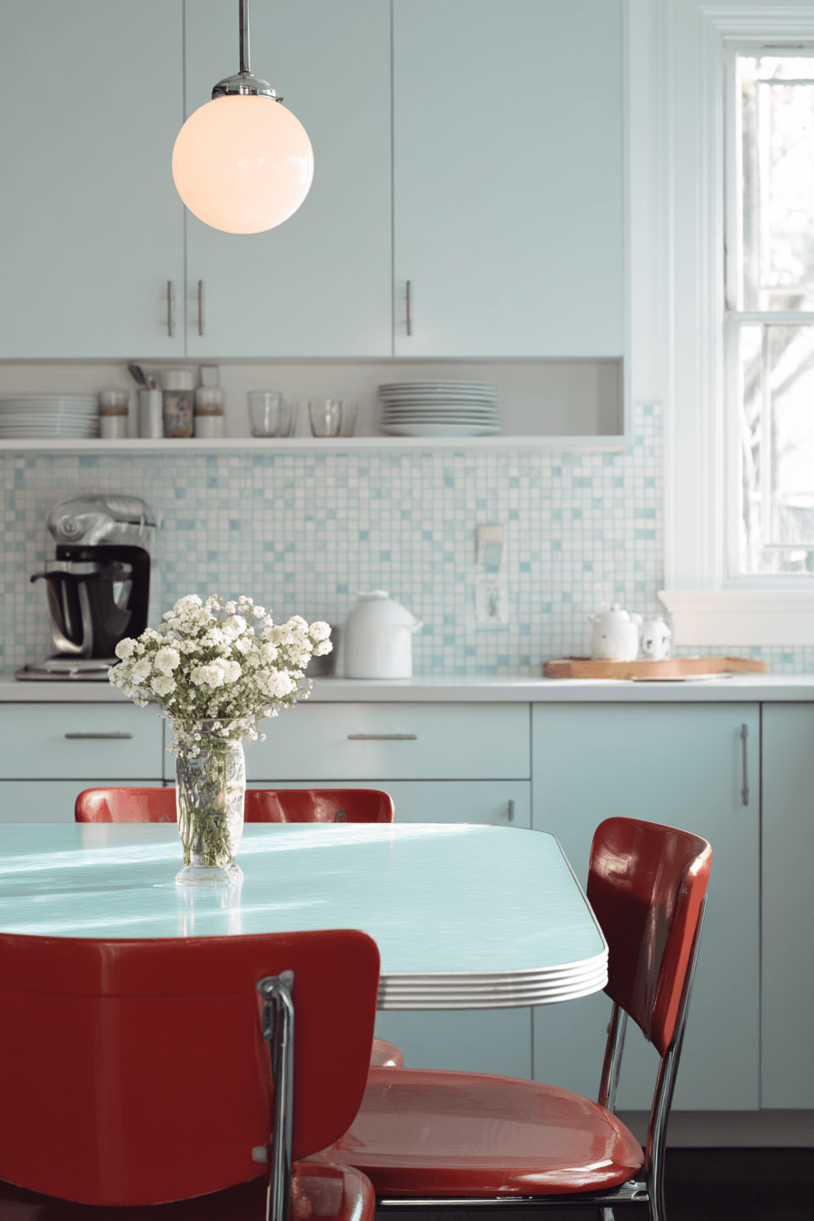 Retro Formica finishes add a playful, nostalgic touch to modern kitchens while still offering practical benefits. The smooth surface is easy to clean and visually lightweight, making it ideal for smaller spaces. Bright colors or subtle patterns can bring personality without overwhelming the design. These small kitchen table ideas work by blending vintage flair with modern functionality. Pairing the table with simple seating keeps the look balanced and fresh. The mood feels fun, lively, and full of character. Tap to add a retro twist to your kitchen.