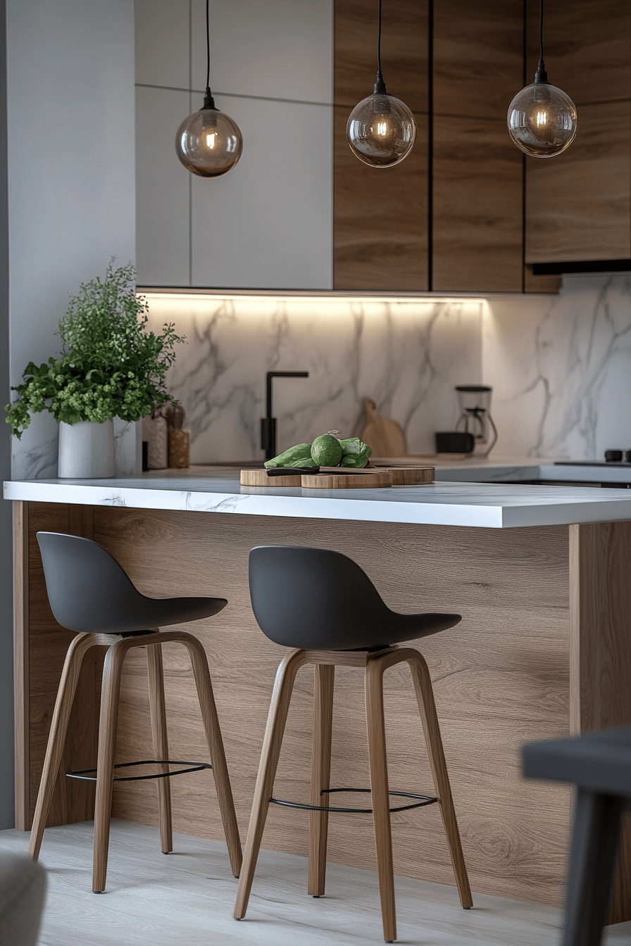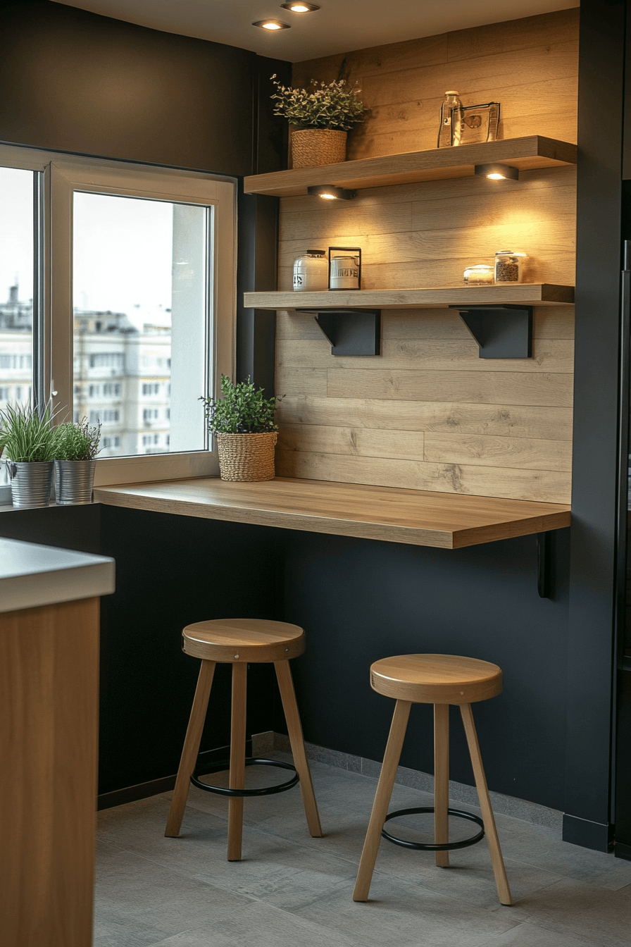 An elevated bar-style ledge creates a casual dining spot without taking up valuable floor space, making it perfect for compact kitchens. Its slim, streamlined profile keeps the layout open and flexible while still providing a functional surface. Paired with stools that tuck neatly underneath, the design remains clean and efficient. Small kitchen table ideas like this maximize vertical space, turning unused areas into practical dining zones. Adding subtle lighting or decor can enhance the overall look without clutter. The mood feels modern, social, and effortlessly functional. Explore this setup for a smart kitchen upgrade.