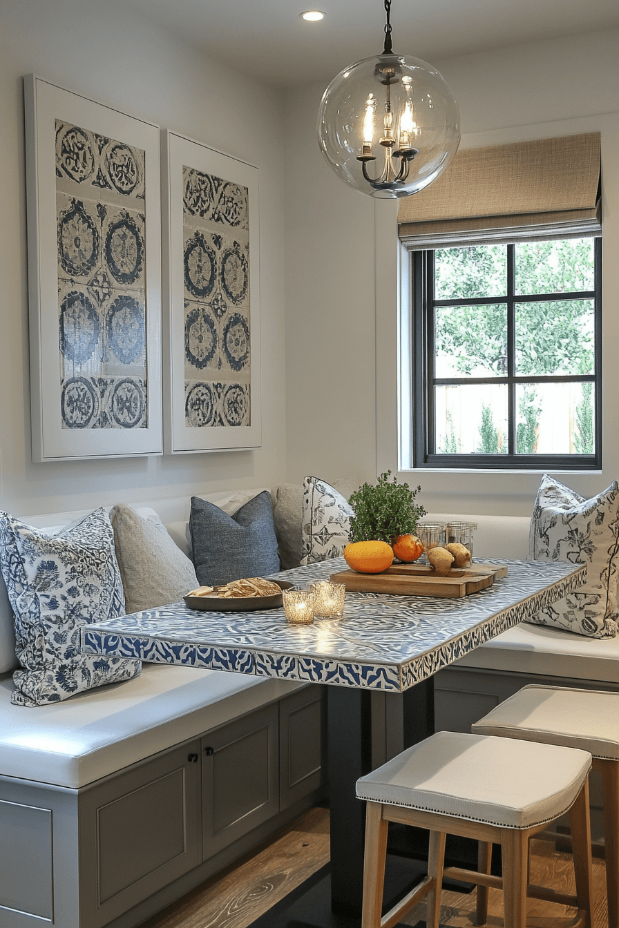 A mosaic tabletop adds intricate detail and visual charm while maintaining a compact and functional size. The patterned surface becomes an instant focal point, reducing the need for additional decorative elements. Paired with simple seating, the overall look stays balanced and visually appealing. Small kitchen table ideas like this combine artistry with everyday usability. Adding subtle accents can complement the pattern without competing with it. The mood feels vibrant, creative, and full of personality. Tap to explore bold patterns for your kitchen.