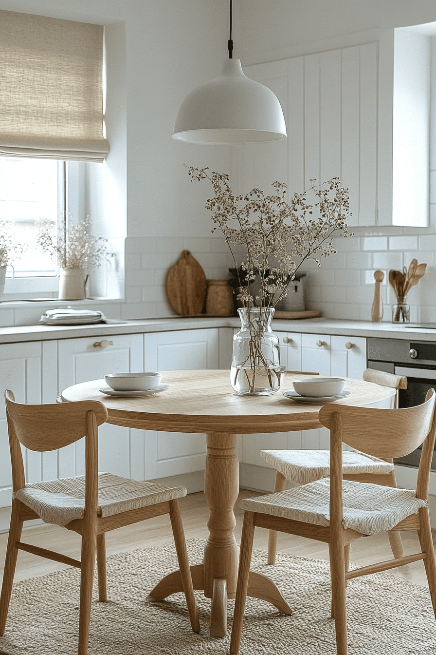 Light oak finishes and clean Scandinavian lines give this dining setup a calm, breathable feel that instantly opens up the room visually. The table’s compact proportions and subtle grain pattern keep it visually light while still grounding the space with natural warmth. Paired with simple, streamlined seating, the design avoids visual clutter and maintains a cohesive, harmonious look. These small kitchen table ideas shine by focusing on functionality, natural materials, and intentional simplicity. Adding soft textiles like a neutral rug or linen cushions can enhance the cozy factor without overwhelming the space. The mood is relaxed, airy, and quietly stylish, perfect for everyday living. Explore this look for a fresh, minimalist kitchen upgrade.