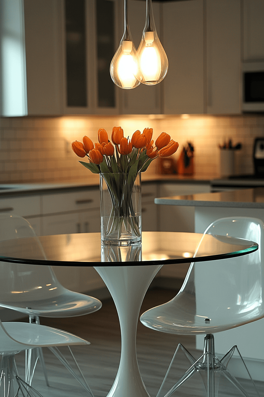 A glass-top table with a tulip-style base creates a stunning floating effect that visually expands the room and makes even the smallest kitchen feel more open. The transparent surface allows light to pass through freely, reducing visual weight and keeping the space from feeling boxed in. Curved edges soften the overall look while maintaining a sleek, modern aesthetic that pairs well with various decor styles. Small kitchen table ideas like this work because they combine elegance with spatial awareness, making the most of limited square footage. Pairing the table with slim-profile chairs or ghost seating enhances the illusion of openness. The mood is light, modern, and effortlessly chic with a hint of sophistication. Click to discover how glass elements can open up your space.