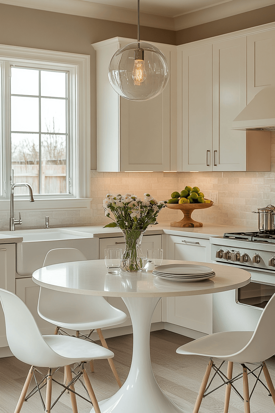 A minimal round table becomes the perfect centerpiece for tight kitchen layouts, offering both functionality and visual flow. Its curved shape allows for easy movement around the space, eliminating sharp edges that can disrupt traffic. Neutral finishes keep the design cohesive and adaptable, making it easy to pair with different decor styles over time. These small kitchen table ideas work by simplifying the layout while still providing a comfortable gathering space. Adding a small centerpiece or soft lighting can enhance the inviting atmosphere without adding clutter. The mood feels open, calm, and effortlessly welcoming. Click to see how round designs improve flow in small kitchens.