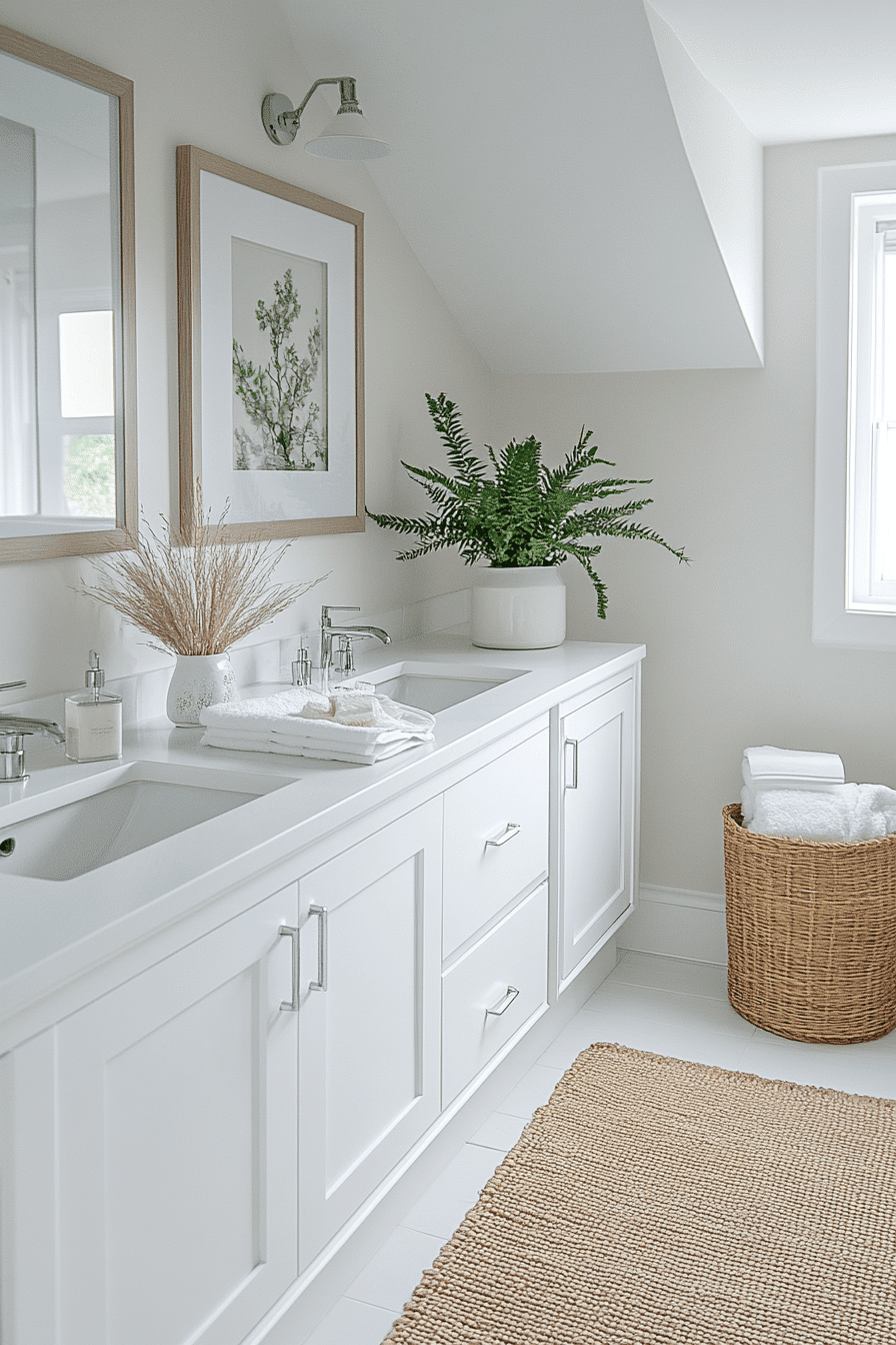Bright white surfaces give the room a clean, fresh feel while maximizing light reflection. Glossy finishes and minimal decor keep everything crisp and uncluttered. The space feels open and breathable, even in a smaller footprint. Subtle contrasts add depth without overwhelming the design. Pairing white with soft textures prevents the look from feeling too sterile. These small master bath ideas thrive on clarity and brightness to expand the visual space. Click to experience this refreshing style.