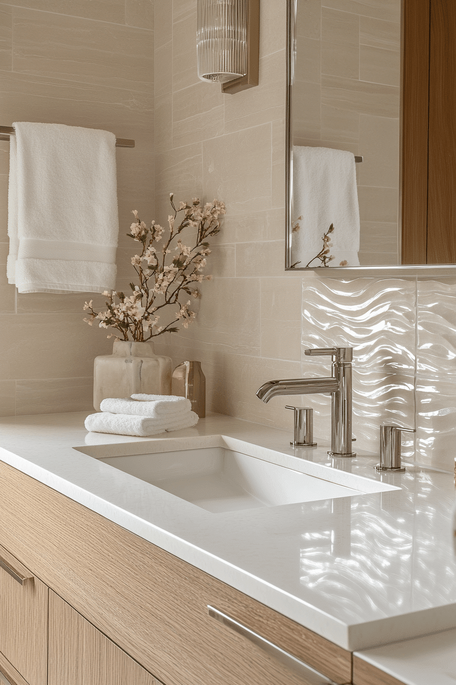 Refined tile patterns bring subtle detail while keeping the overall look cohesive and modern. Soft textures and neutral tones prevent the design from feeling busy. The layout stays clean, allowing the tile work to enhance rather than dominate. Light reflects gently across the surfaces, adding dimension. Using larger tiles can help reduce grout lines and visually expand the space. These small master bath ideas use detail wisely to elevate without overcrowding. Tap to explore this polished finish.
