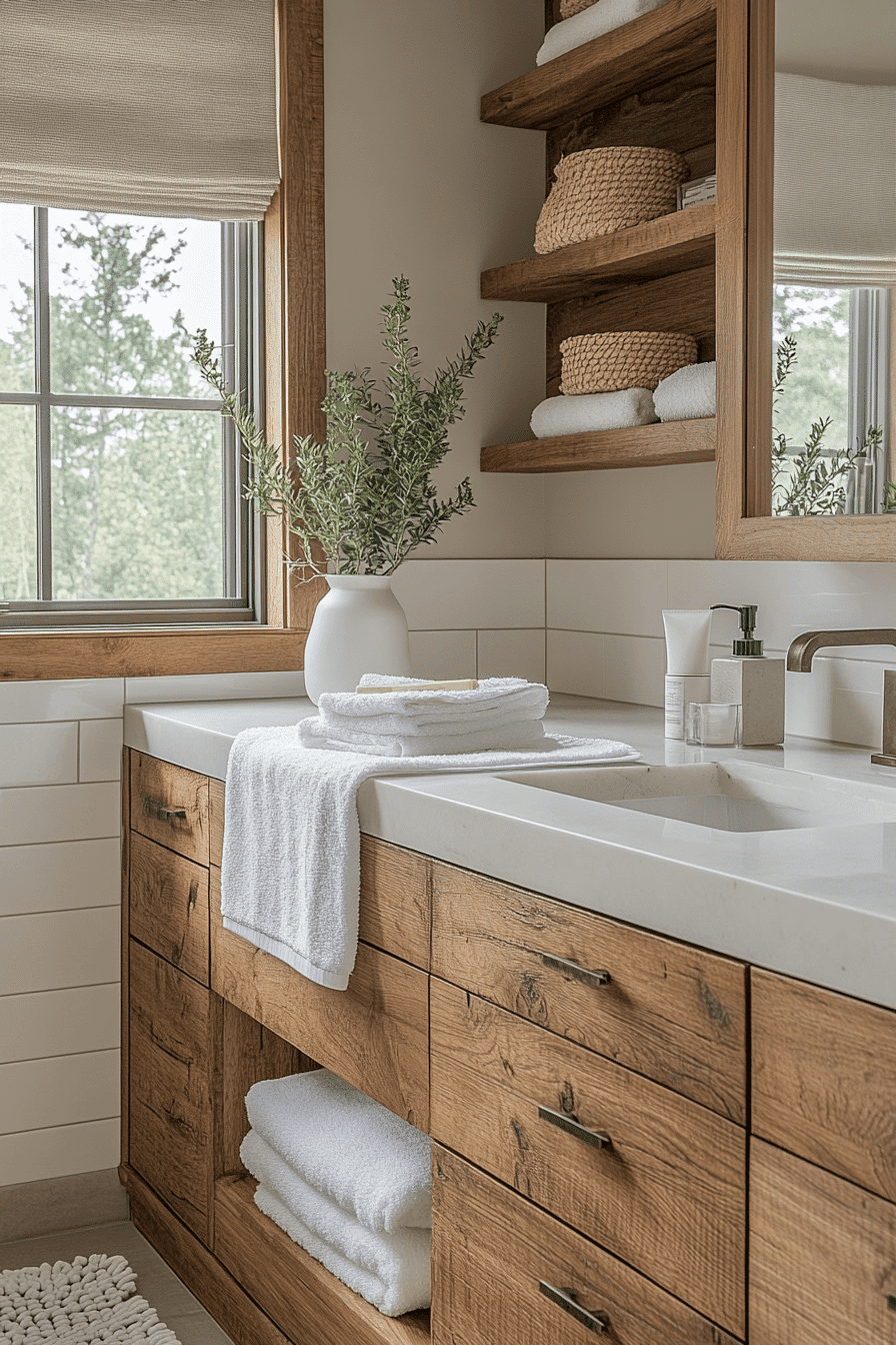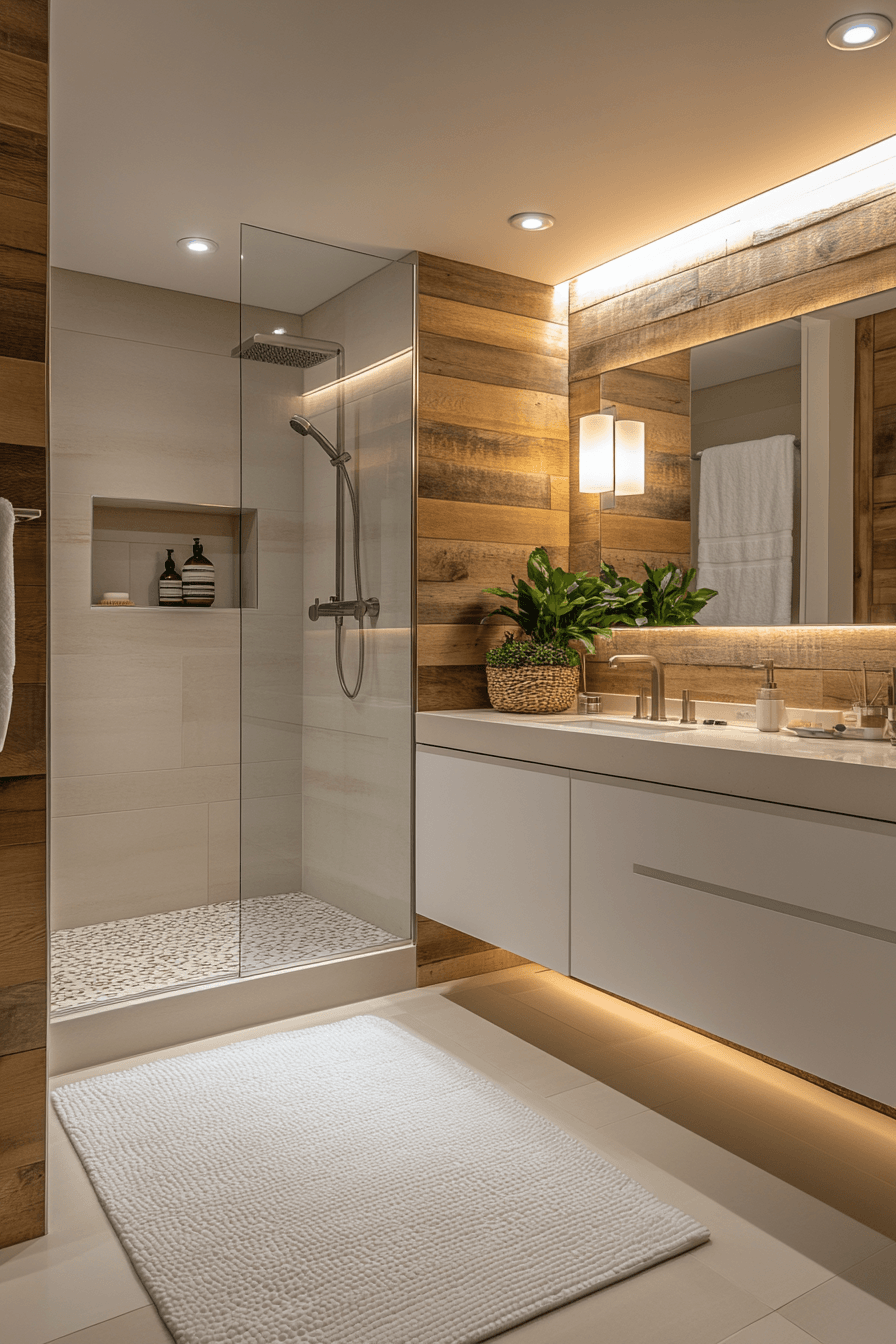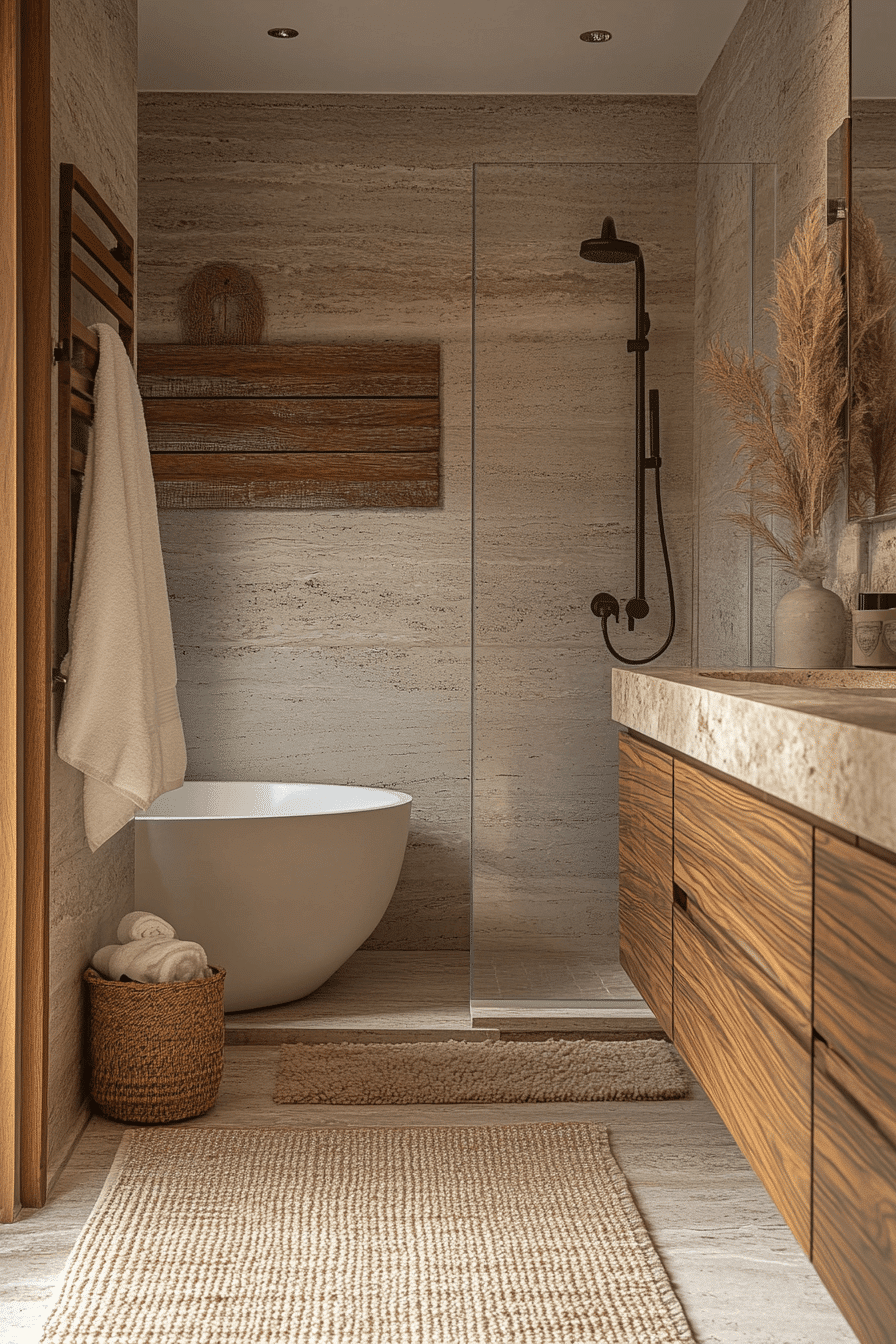 Natural wood elements bring warmth and texture while maintaining a modern and balanced look. The tones add depth without making the space feel heavy, especially when paired with lighter finishes. Clean lines keep the wood from feeling rustic and instead give it a refined, contemporary edge. The combination of organic textures and smooth surfaces creates a layered yet uncluttered design. Even small touches like a wood vanity or shelving can transform the overall feel. These small master bath ideas show how organic materials enhance small spaces beautifully. Click to see this warm design approach.