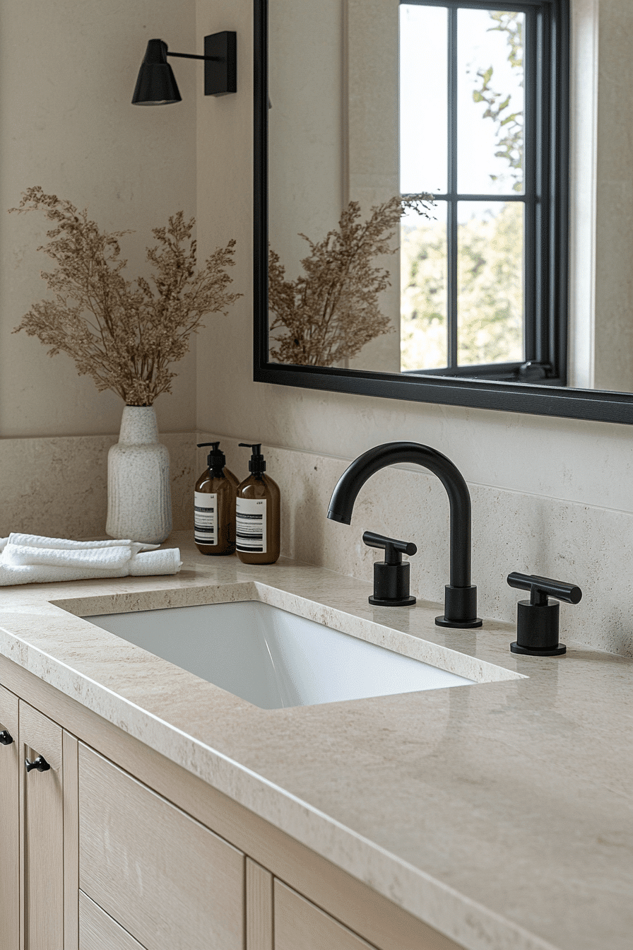 Matte black accents add contrast and sophistication without overwhelming the space. Paired with lighter tones, they create a bold yet balanced look that feels intentional rather than heavy. The finishes feel modern and sleek while still maintaining warmth through thoughtful material pairings. Strategic lighting keeps the darker elements from closing in the room and instead highlights their clean edges. Incorporating matte black in fixtures, frames, or hardware adds depth without cluttering the layout. These small master bath ideas show how contrast can enhance depth and style while keeping everything visually sharp. Tap to explore this dramatic look.