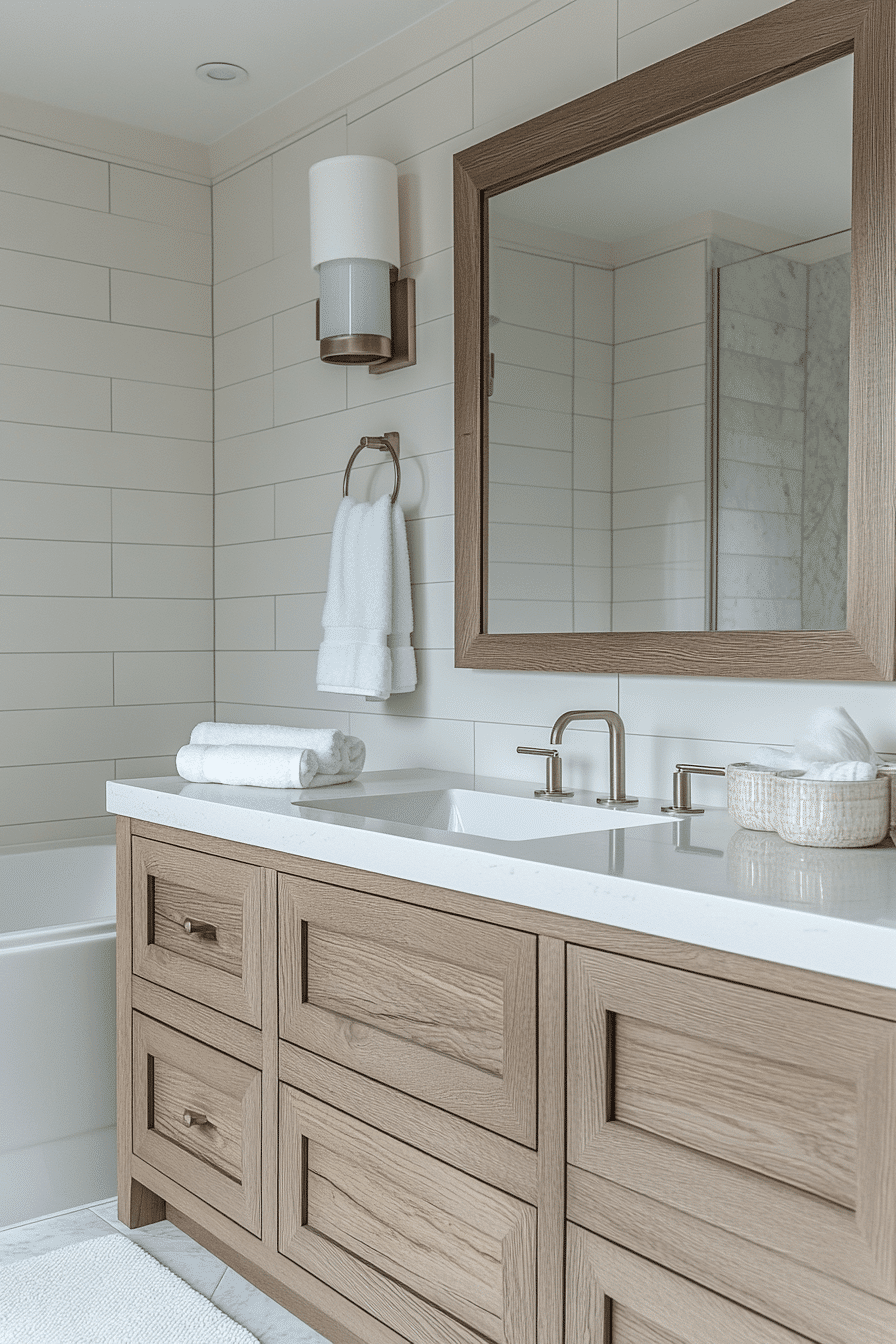 A zen-inspired approach brings calm through simplicity, soft tones, and natural materials. Clean lines and minimal decor create a peaceful, uncluttered environment. Gentle textures like wood and stone add warmth without distraction. The mood feels tranquil and grounding, perfect for daily routines. Keeping accessories minimal reinforces the sense of balance and clarity. These small master bath ideas focus on balance and serenity in a limited space. Click to embrace this peaceful design.