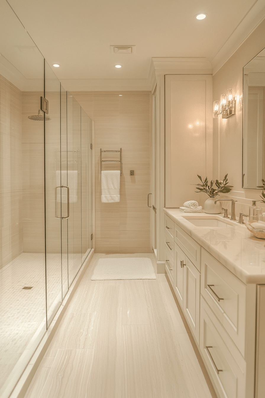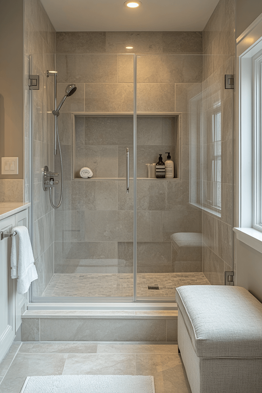A streamlined shower design keeps the layout open and uncluttered from every angle. Glass panels and minimal hardware enhance the modern feel while allowing light to move freely. The space feels larger thanks to the uninterrupted flow of surfaces and clean lines. Neutral tones keep everything cohesive and calming, avoiding visual breaks. Built-in niches can add storage without disrupting the sleek look. These small master bath ideas focus on simplicity for maximum impact and visual expansion. Explore this clean and functional style.