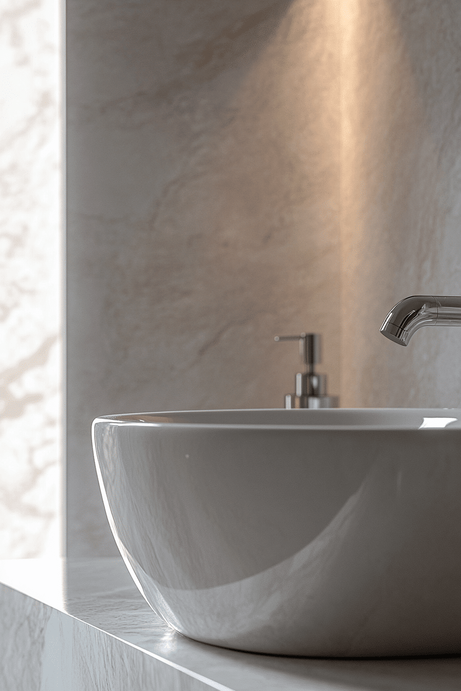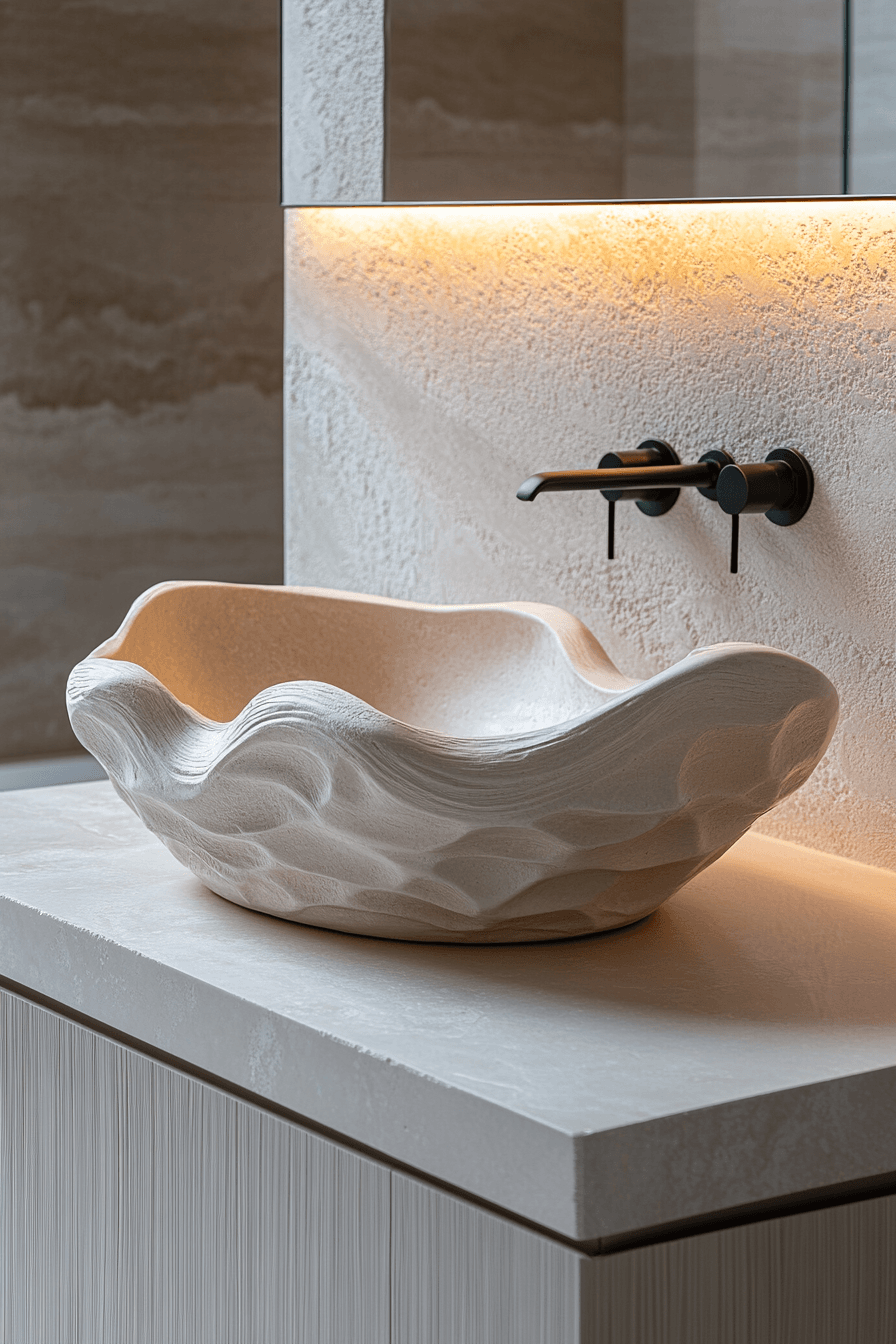 A sculpted basin becomes a standout feature that adds artistic flair to the space. Clean surroundings keep the focus on its unique shape and finish without visual distraction. The design feels modern and thoughtfully curated, like a piece of functional art. Light enhances the contours and textures beautifully, highlighting every detail. Pairing it with minimal fixtures ensures the basin remains the centerpiece. These small master bath ideas prove that one statement piece can define the entire room with impact. Discover how to make a bold impact.