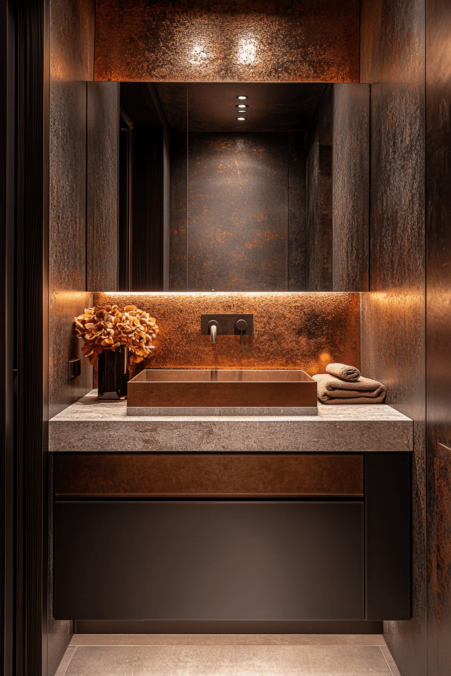 Bronze accents add a touch of luxury while keeping the palette rich and inviting. The warm tones contrast beautifully with lighter surfaces, creating a soft yet noticeable statement. Subtle metallic finishes catch the light gently, adding dimension without overpowering the room. The overall feel is elegant and slightly dramatic while still remaining approachable. Using bronze in fixtures, mirrors, or hardware creates a cohesive and elevated look. These small master bath ideas use warm metals to elevate the design effortlessly and add personality. Tap to explore this luxe detail.