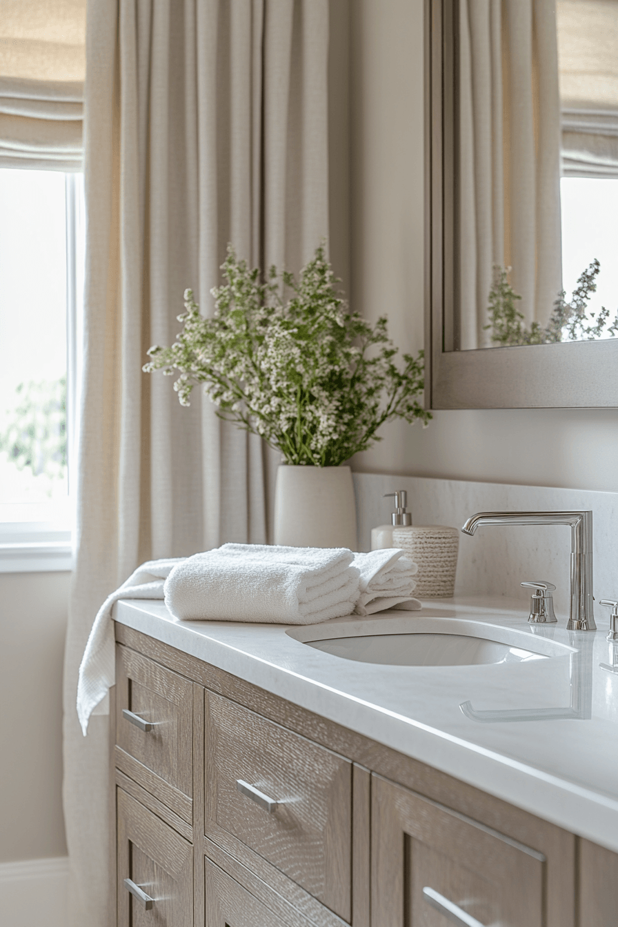 Soft linen elements bring a cozy and relaxed feel to the space while softening harder surfaces. Light fabrics and gentle tones create an inviting atmosphere that feels calm and comfortable. The textures add warmth without adding visual weight, keeping the room open and airy. Layering linens through towels, curtains, or small accents enhances the overall softness. The design feels effortless, natural, and easy to maintain for everyday use. These small master bath ideas show how softness can transform a modern space into something more welcoming. Explore this cozy finishing touch.