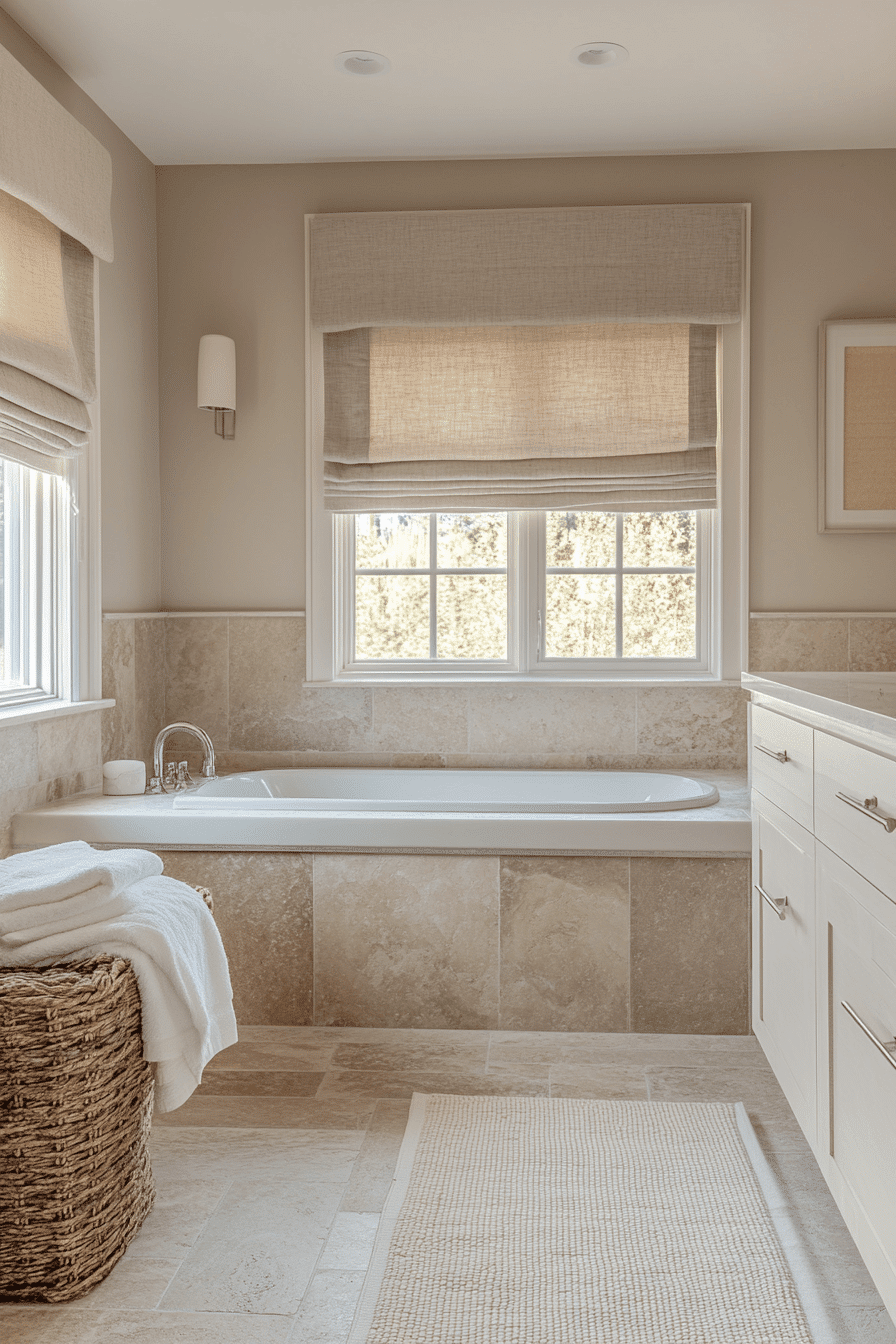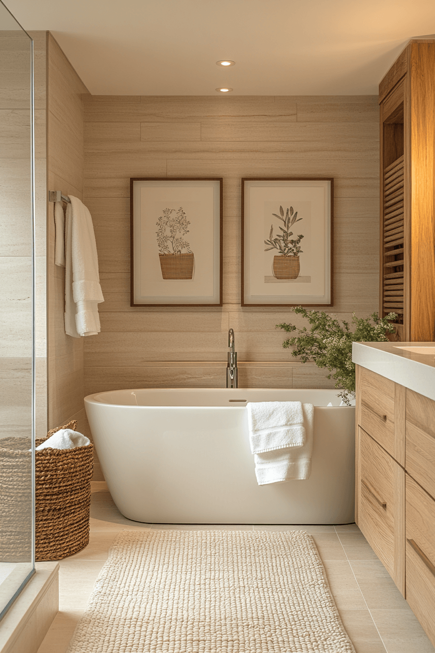 Soft beige tones create a calming and cohesive look that feels both modern and timeless. Layered textures like stone, linen, and wood keep the design from feeling flat. The palette reflects light beautifully, making the room appear more spacious. Subtle decor elements add warmth without cluttering the layout. A monochromatic approach helps everything feel seamless and intentional. These small master bath ideas prove that simplicity can still feel rich and inviting. Explore this effortlessly elegant space.