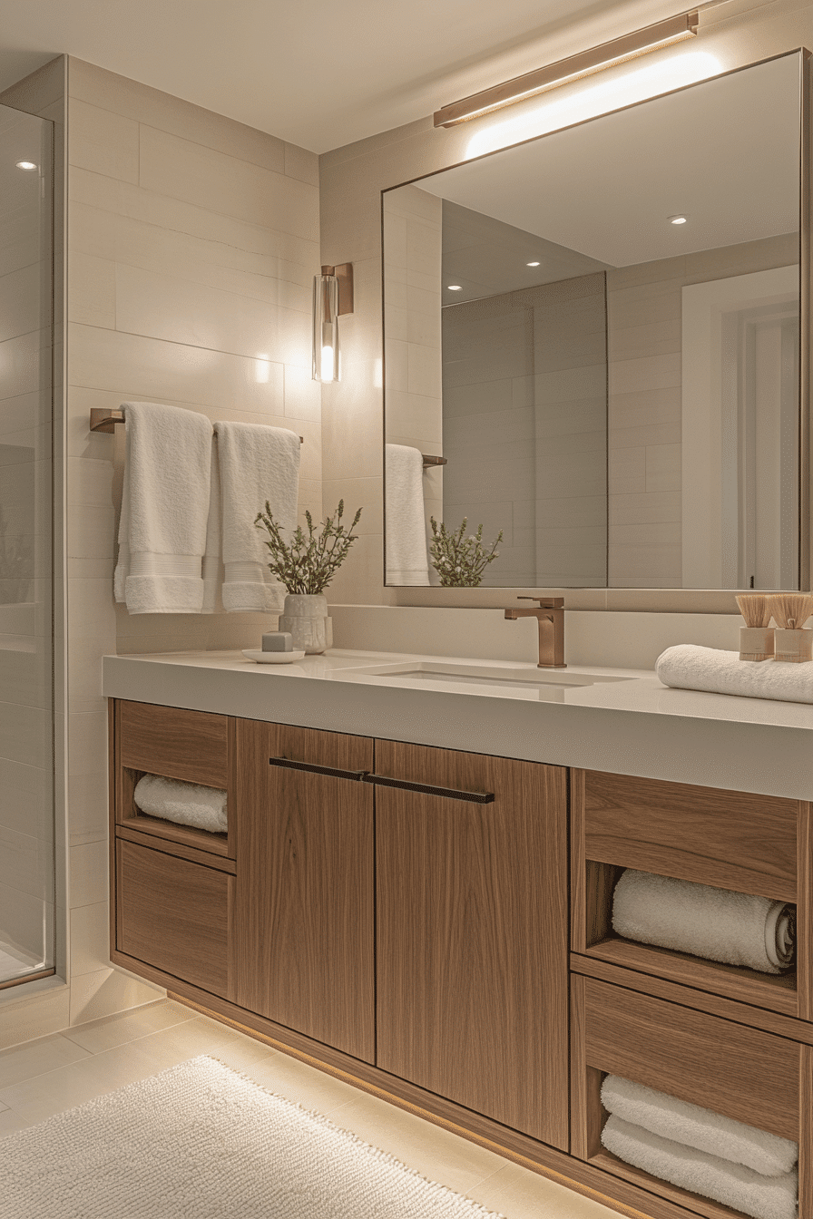Warm neutral tones wrap the space in comfort while still keeping everything visually light and modern. Creamy hues, soft textiles, and natural wood accents create a welcoming atmosphere. The design feels cozy without ever looking cramped thanks to thoughtful layering. Soft lighting enhances the warmth and adds a relaxing glow. Mixing finishes like matte and satin adds subtle richness without heaviness. These small master bath ideas balance comfort and openness in a beautiful way. Explore how to create this inviting retreat.