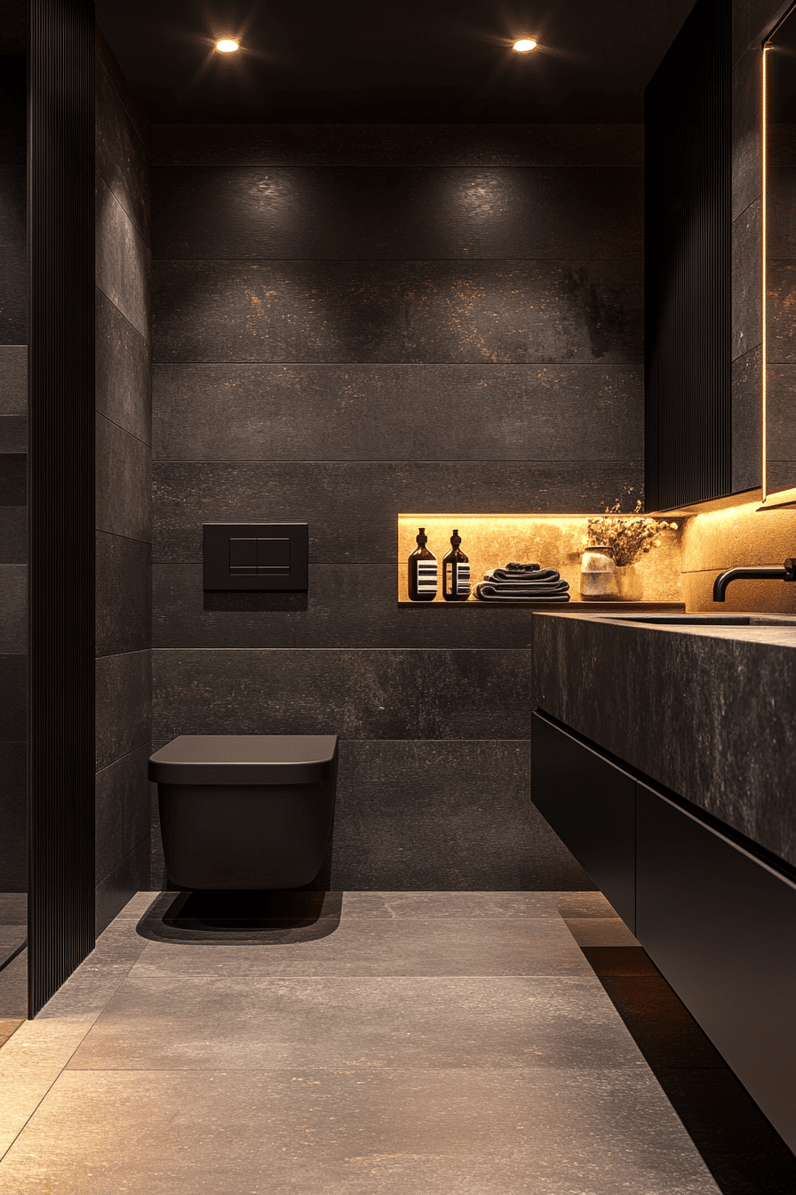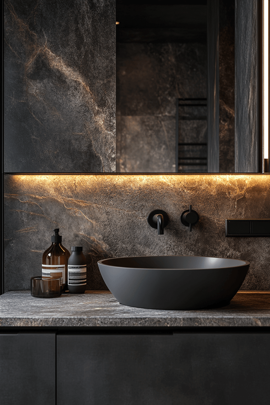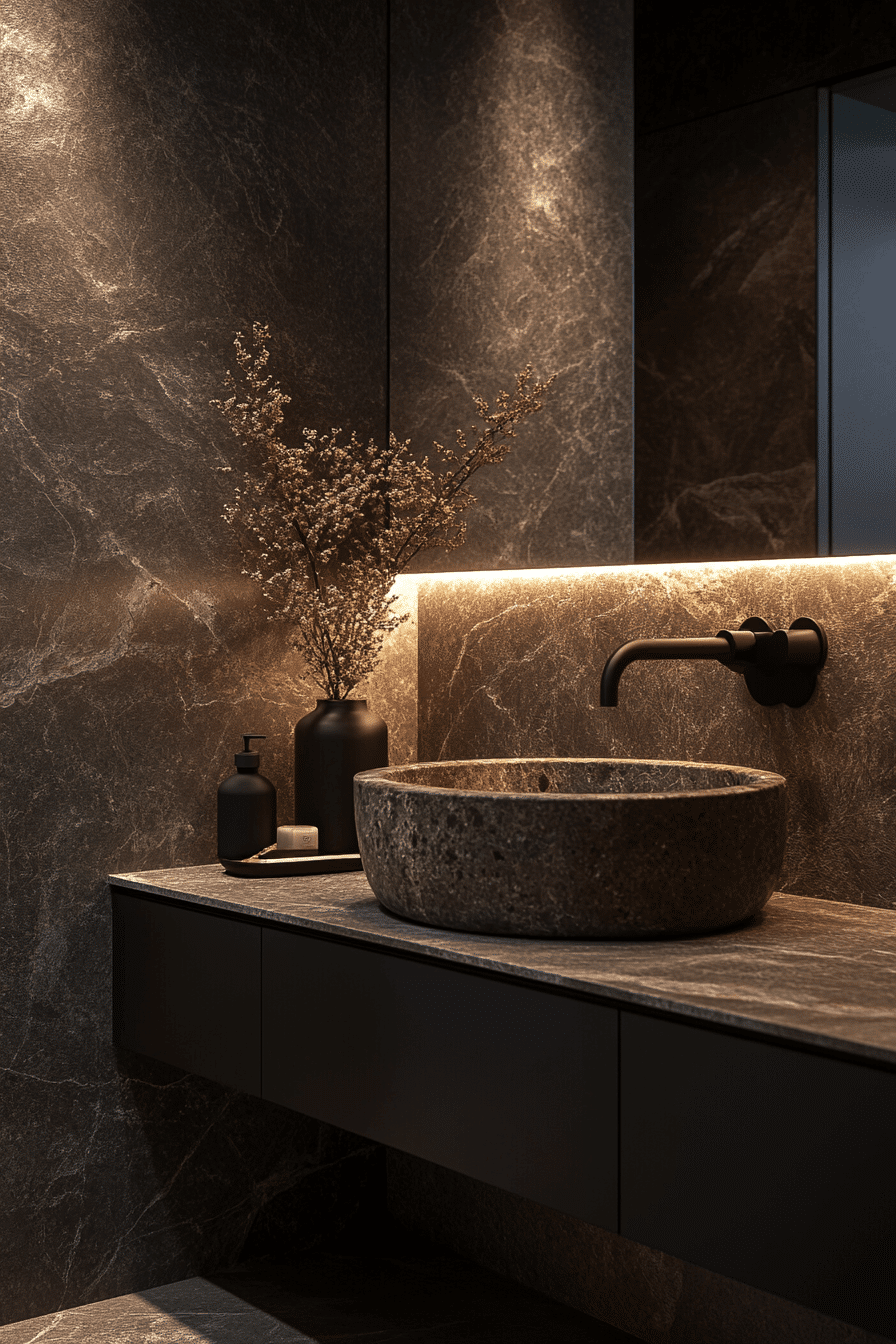 Shadow stone elements introduce natural texture while maintaining a deep, moody palette. The organic patterns add warmth and visual interest to the darker tones. In a small moody bathroom, stone brings balance between raw materials and refined design. Subtle lighting enhances its natural beauty and highlights its unique variations. Pairing stone with sleek fixtures keeps the look modern. The contrast between textures creates depth without clutter. The overall feel is grounded, sophisticated, and timeless. Explore how stone elevates the mood.