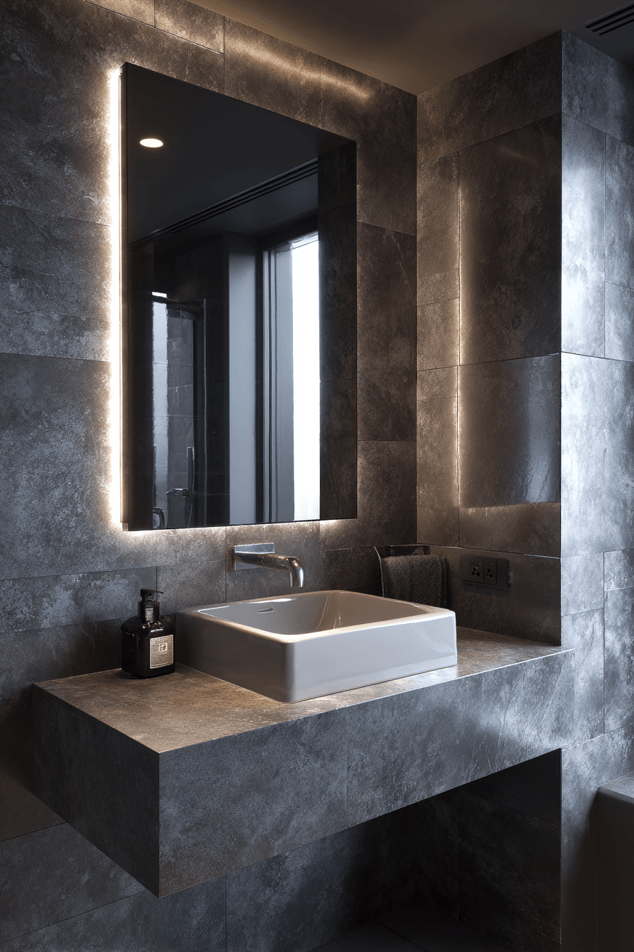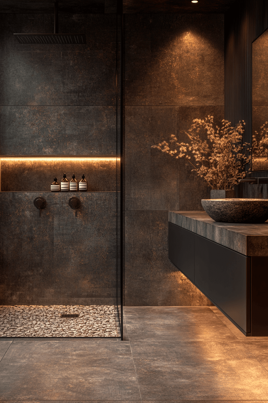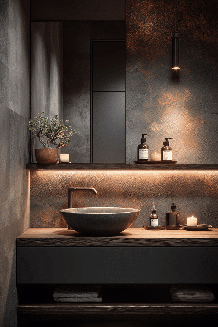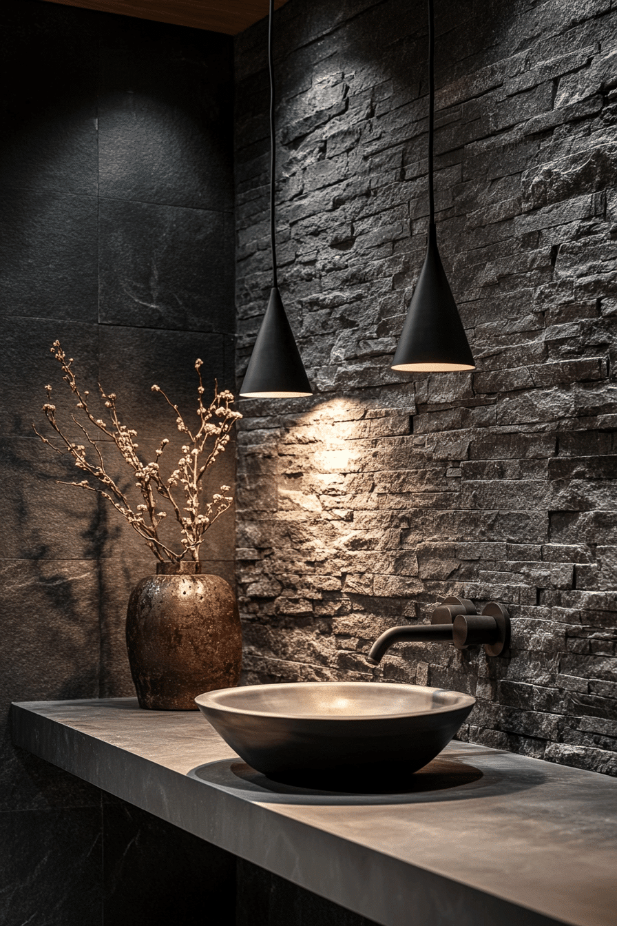 Shadow stone elements introduce natural texture while maintaining a deep, moody palette. The organic patterns add warmth and visual interest to the darker tones. In a small moody bathroom, stone brings balance between raw materials and refined design. Subtle lighting enhances its natural beauty and highlights its unique variations. Pairing stone with sleek fixtures keeps the look modern. The contrast between textures creates depth without clutter. The overall feel is grounded, sophisticated, and timeless. Explore how stone elevates the mood.