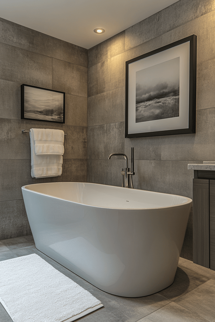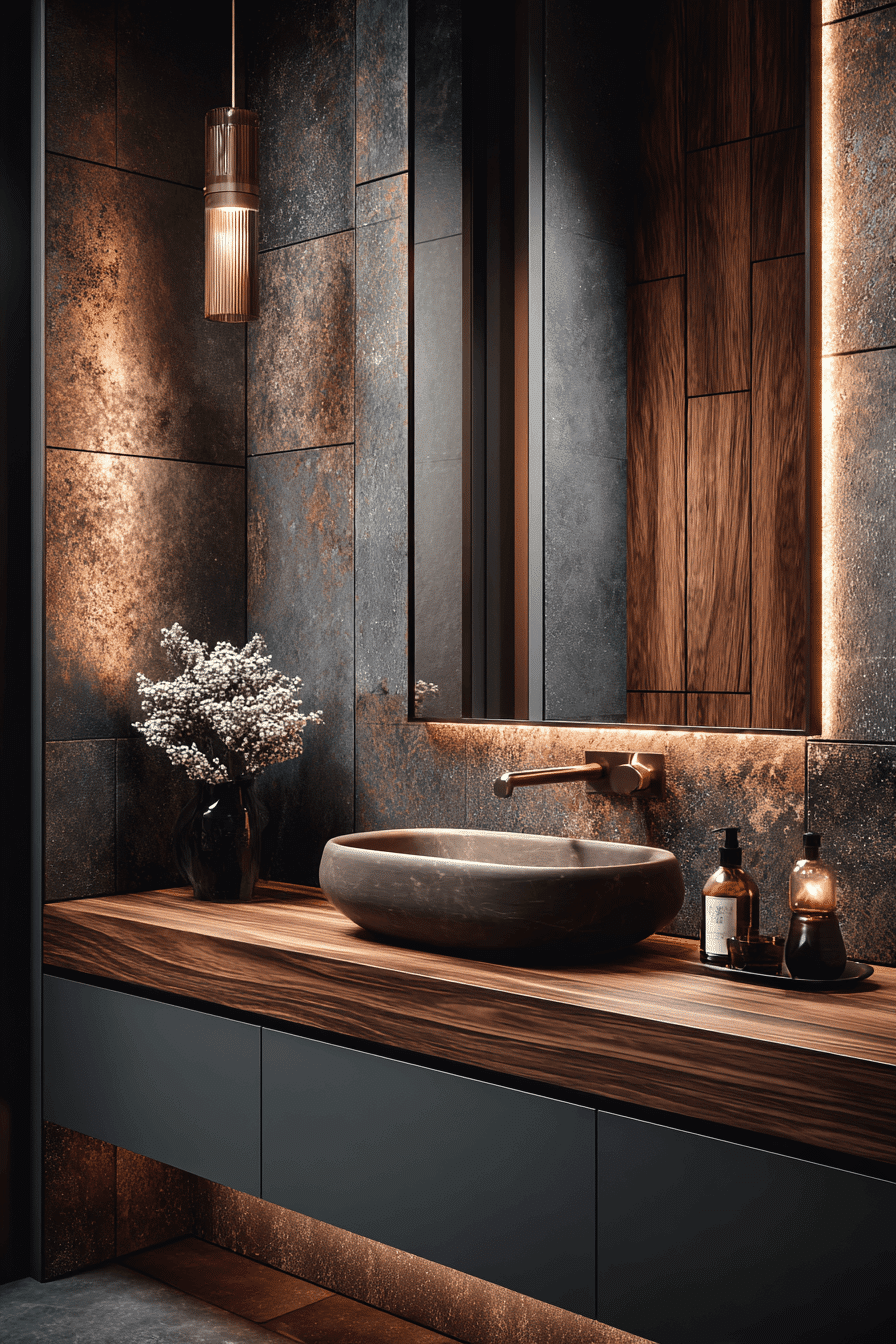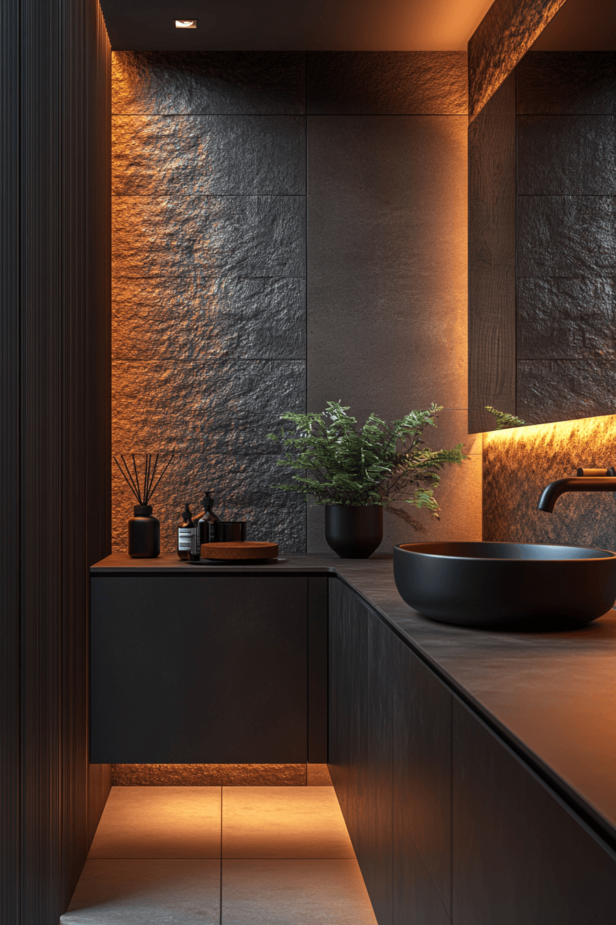 Twilight textures combine layered materials with soft lighting for a dynamic yet calming effect. The interplay of matte, glossy, and natural finishes adds visual interest without clutter. In a small moody bathroom, textures help create depth and dimension where space is limited. Gentle lighting enhances every surface, revealing subtle details. Combining stone, tile, and metal creates a balanced, curated look. Minimal decor ensures the textures remain the highlight. The mood feels serene, tactile, and visually engaging. Explore the beauty of layered textures.