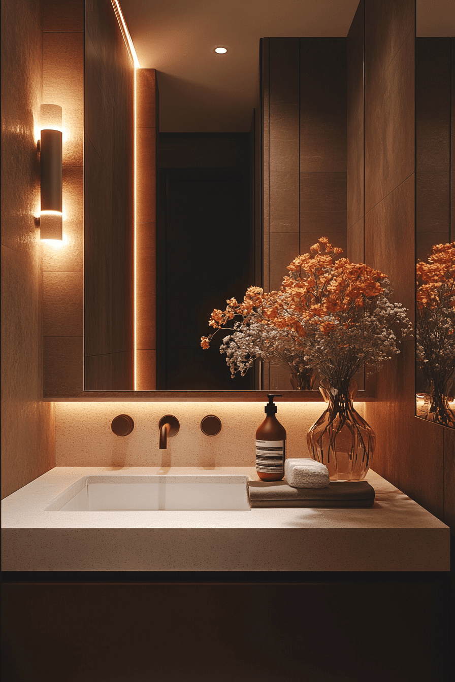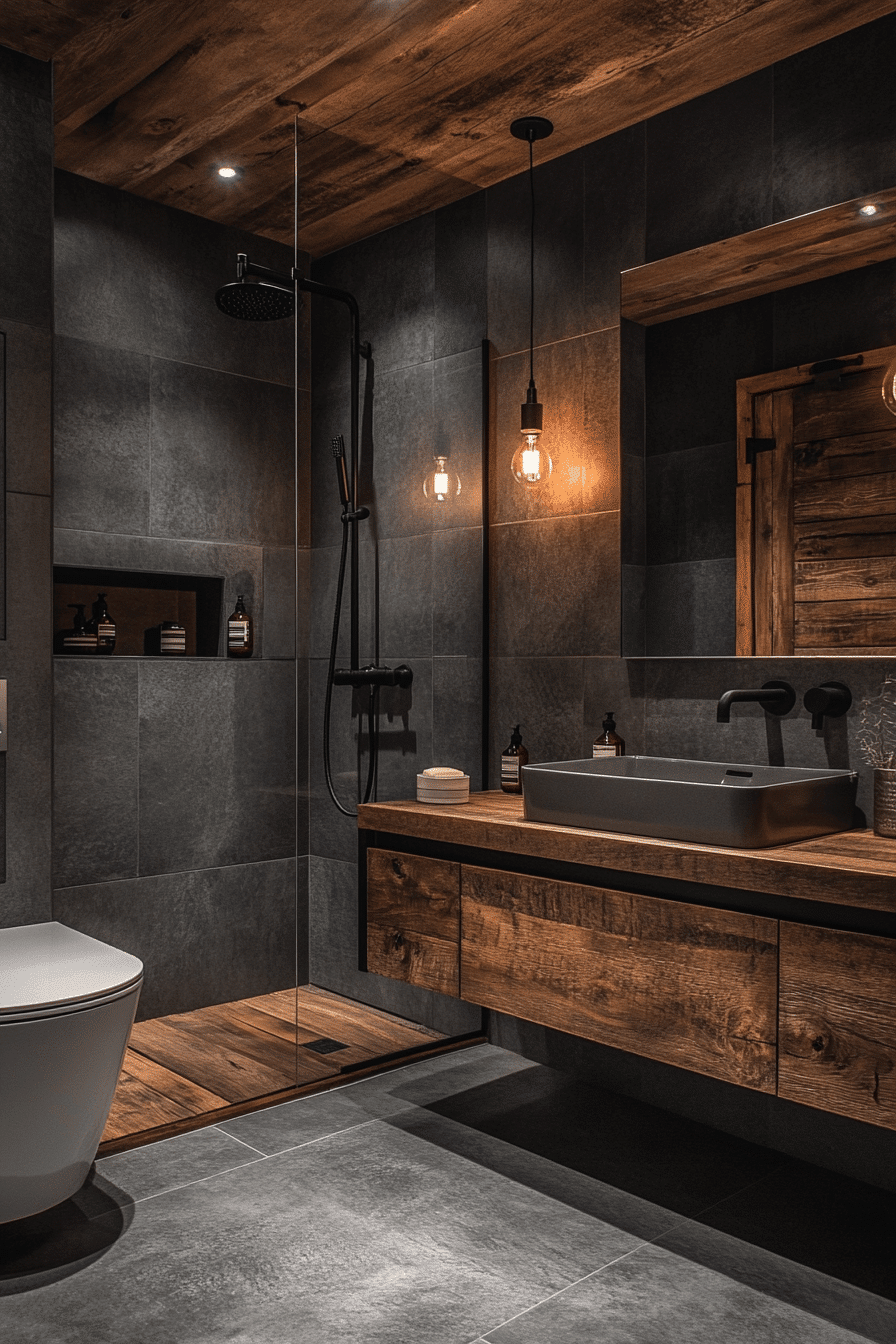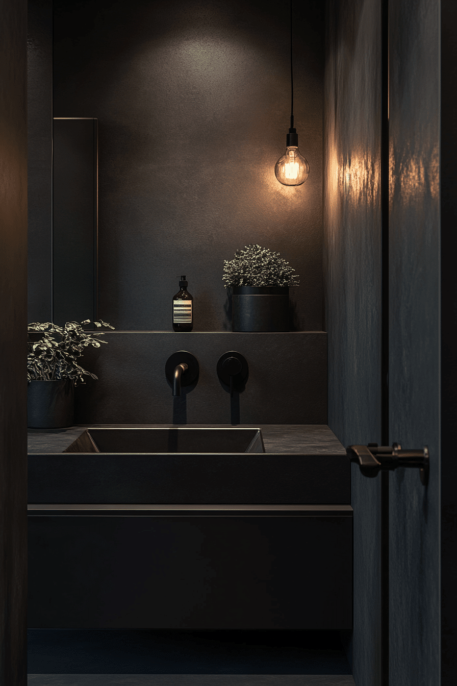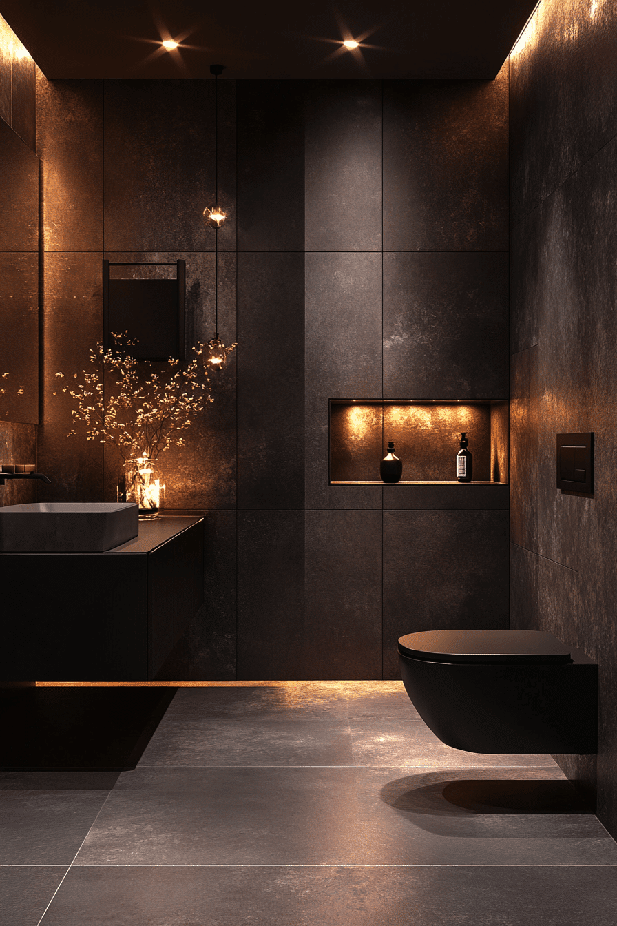 A dim light sanctuary creates a cozy environment with soft, diffused lighting and deep tones. Warm glows enhance textures and make the space feel welcoming rather than dark. This small moody bathroom thrives on subtle lighting rather than brightness, creating a calming ambiance. Dark surfaces absorb light, adding to the intimate and grounded feel. Layered lighting sources help define different areas within the space. Minimal decor ensures the focus remains on atmosphere and comfort. The result feels soothing, quiet, and beautifully balanced. Discover how to design your sanctuary.