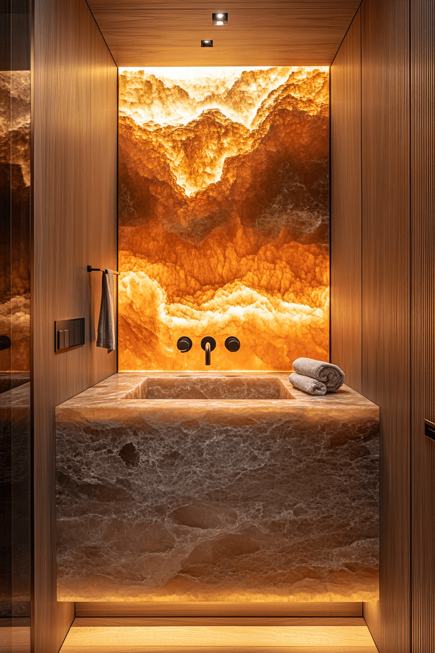 Onyx accents bring luxurious texture and depth into the design with dramatic, eye-catching veining. Paired with subtle lighting, they create a striking focal point that anchors the space. This small moody bathroom uses statement materials to elevate the design without overcrowding it. Smooth surrounding surfaces balance the bold patterns for a cohesive look. Strategic placement on a vanity or wall ensures maximum impact. Minimal hardware keeps attention on the stone’s natural beauty. The result feels rich, sophisticated, and timeless. Tap to discover onyx elegance.