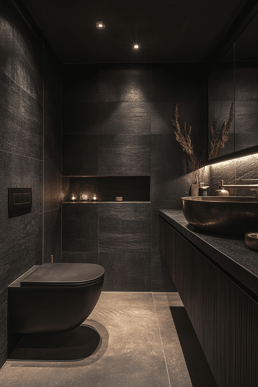 Noir textures create depth through layered materials and subtle variations in finish. The design feels cohesive while offering quiet visual complexity. In a small moody bathroom, textures prevent the space from feeling flat or one-dimensional. Matte surfaces, stone details, and soft textiles work together harmoniously. Balanced lighting highlights each layer without overwhelming the palette. Clean lines keep the overall look modern and controlled. The mood is sophisticated, tactile, and refined. Explore textured noir design.