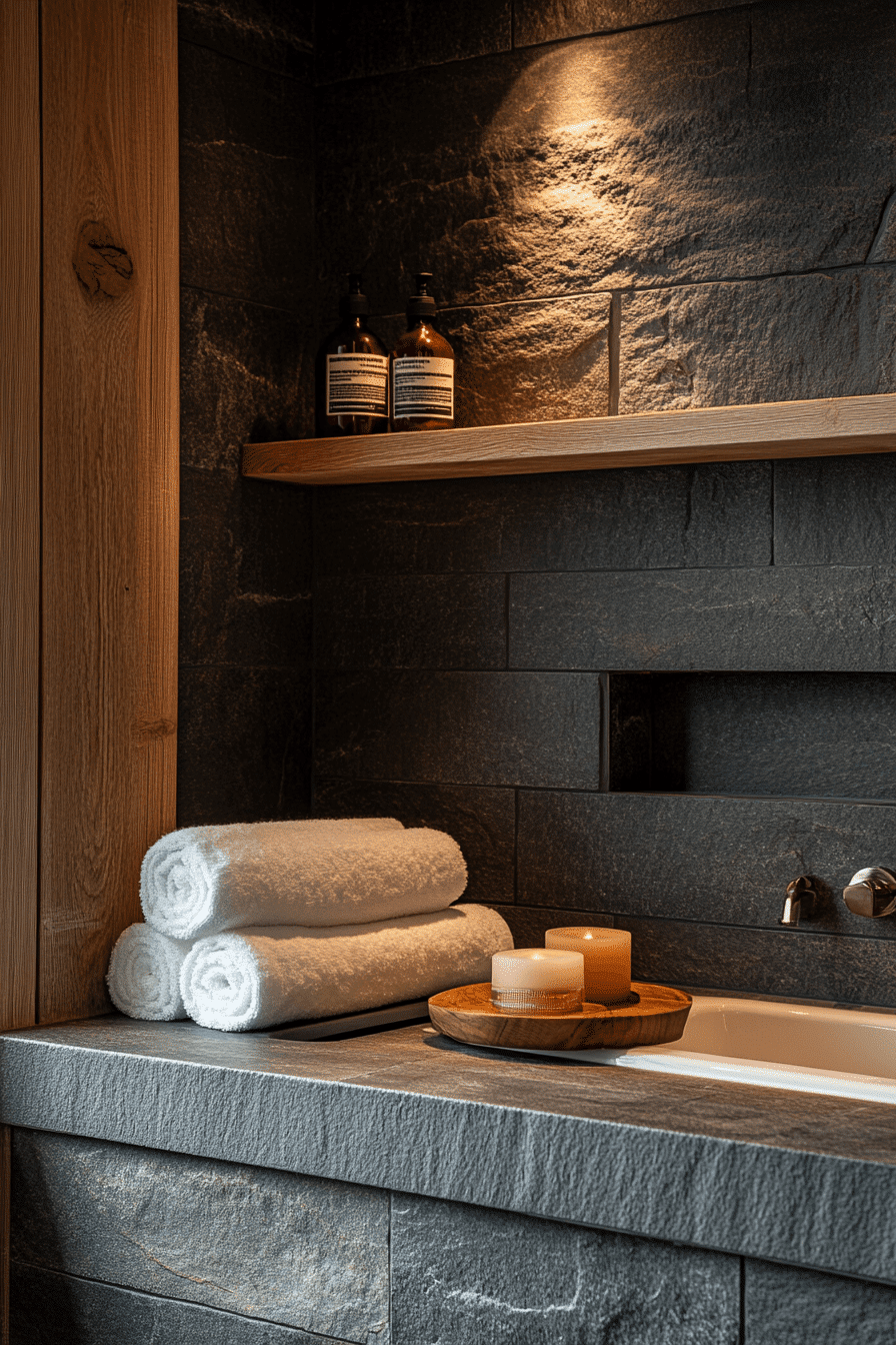A midnight spa nook wraps the space in deep hues that instantly calm the senses. Natural materials like stone and wood soften the darker palette, creating balance and warmth. In a small moody bathroom, this combination creates a peaceful, retreat-like feel without needing extra space. Gentle lighting enhances the relaxing atmosphere and highlights textures. Simple accessories like rolled towels or a small tray add a spa-inspired touch. The layout remains clean to preserve the sense of calm. Every detail feels curated for comfort and quiet luxury. Tap to create your spa escape.