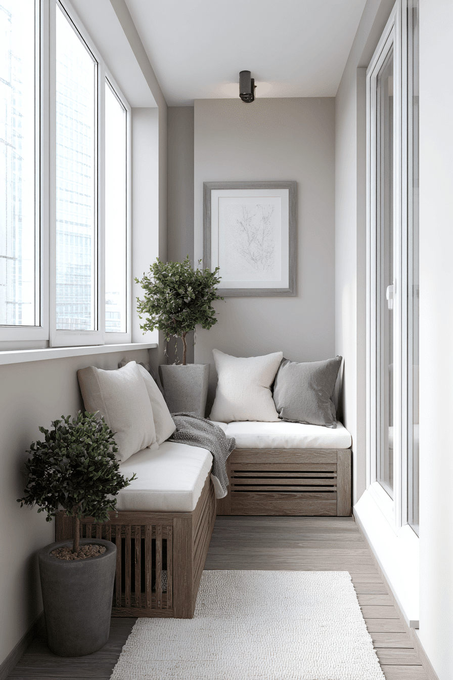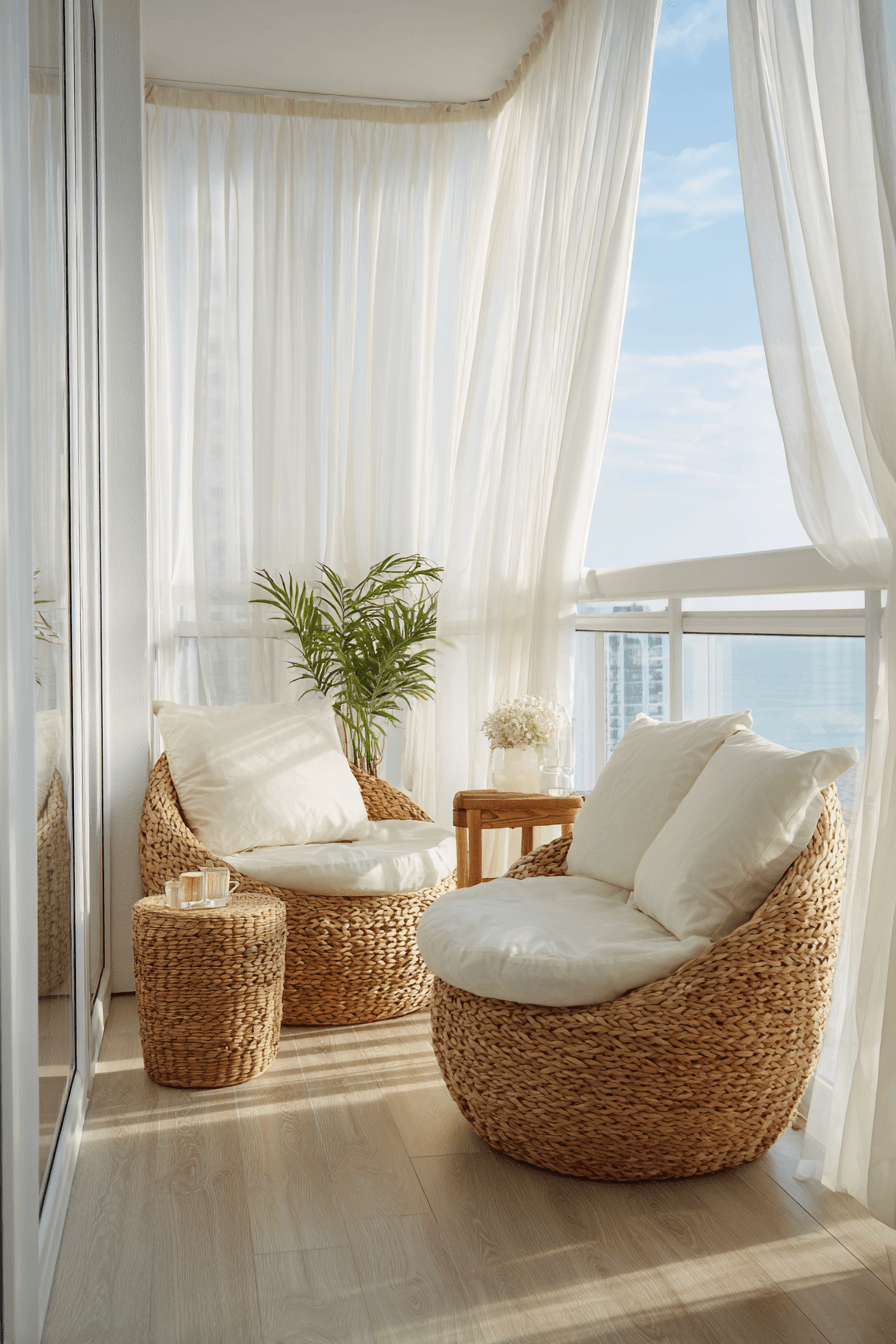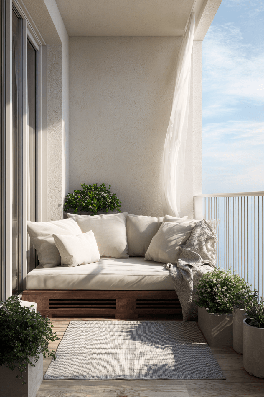This airy design embraces openness with light fabrics and minimal furnishings that enhance very small balcony decor. Flowing curtains or soft drapes add movement and a breezy softness that instantly makes the space feel more inviting. Keeping furniture low-profile helps maintain clear sightlines, which tricks the eye into seeing a larger area. The palette stays light and breezy, with whites, creams, and pale woods reflecting natural light beautifully. Natural materials like linen and wood bring warmth without adding visual weight, keeping everything feeling effortless. A small plant or two adds life without cluttering the space. Click to create your own airy outdoor escape.