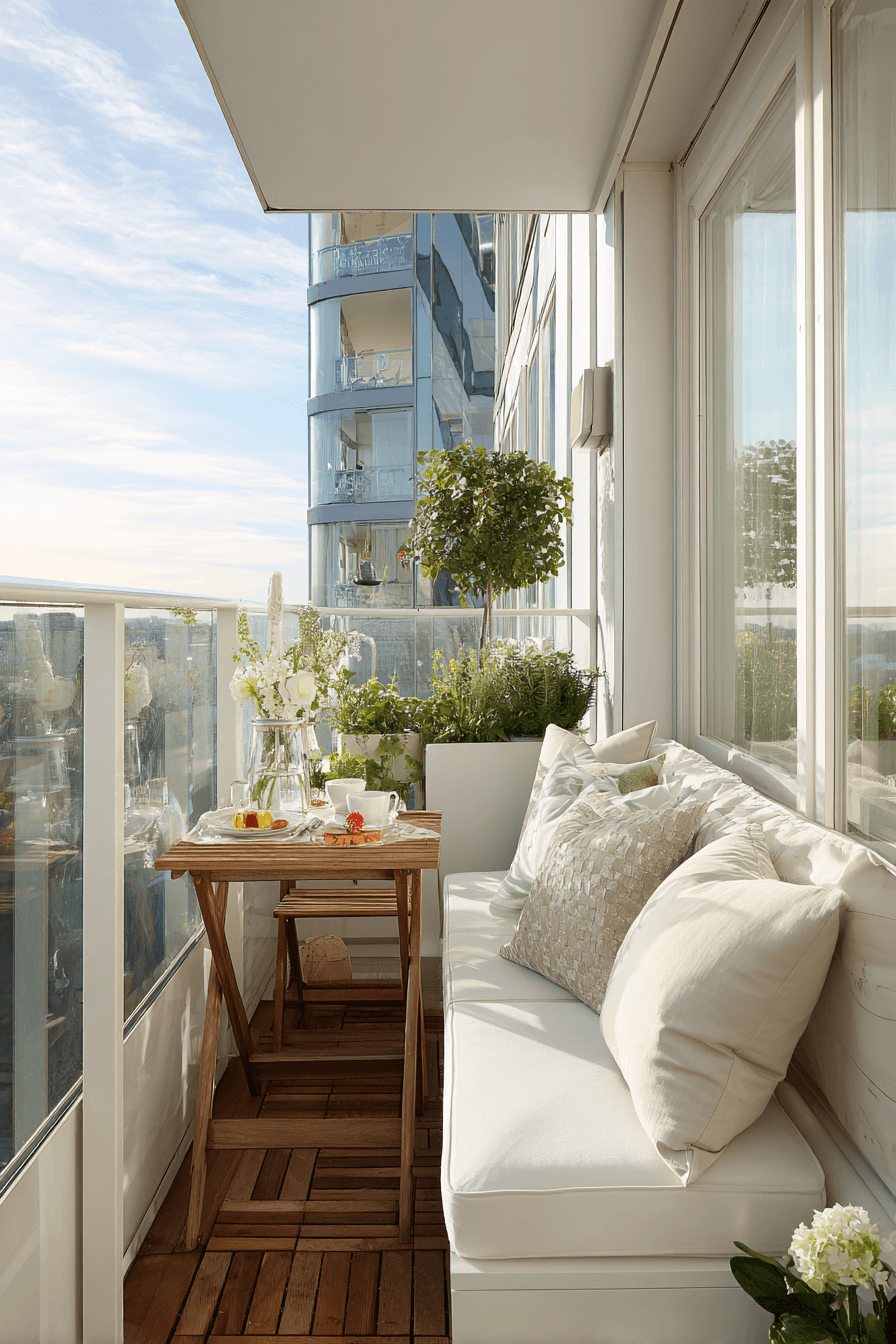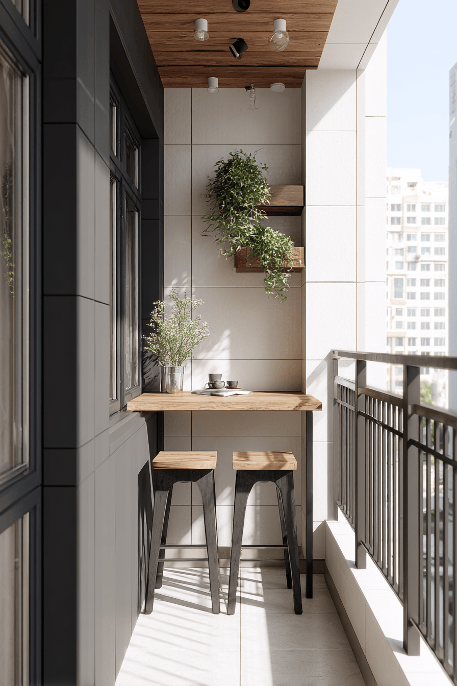 This bright and inviting setup uses light colors and reflective surfaces to enhance very small balcony decor. Pale woods, soft whites, and airy fabrics help bounce natural light throughout the space, making it feel more open. A compact table paired with slim seating creates a perfect spot for coffee or casual meals. The mood feels uplifting and fresh, especially during early mornings or golden hour evenings. Subtle decor elements, like glass accents or light-toned planters, add charm without overwhelming the look. Everything works together to keep the space feeling easy, breezy, and functional. Tap to brighten up your balcony instantly.