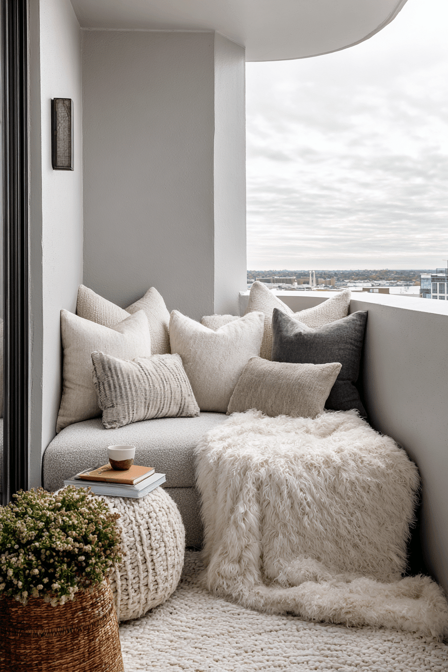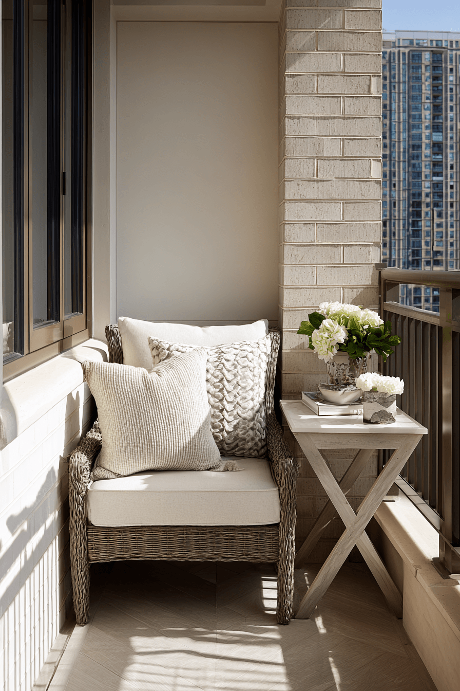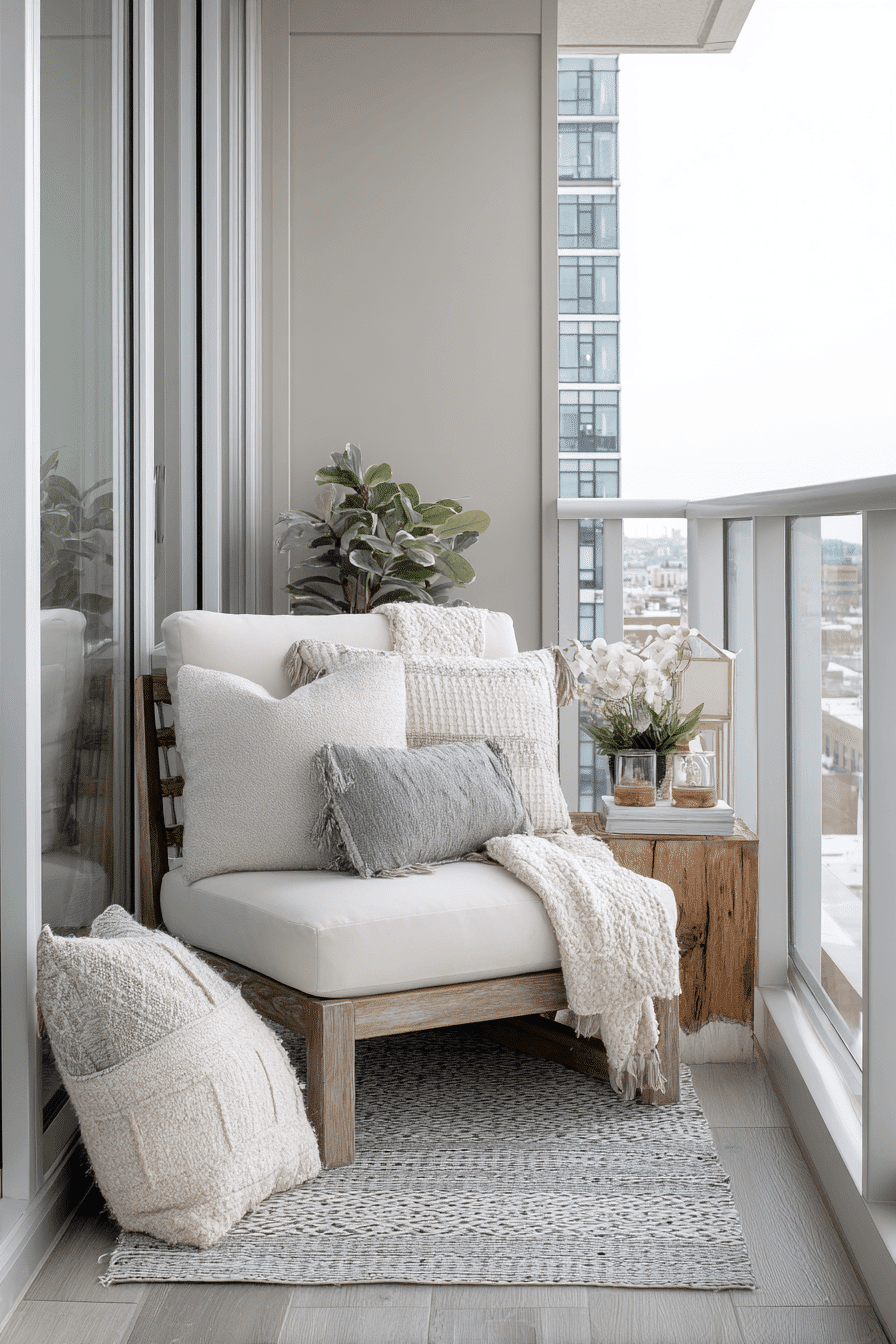 This cozy setup creates a small yet inviting patch of comfort, perfect for very small balcony decor that feels personal and relaxing. Soft cushions and layered textures turn even a simple chair into a spot you’ll want to linger in. Keeping everything grouped together helps define the area without making it feel cramped. Neutral tones keep the look calm, while a few textured elements add depth. A small side table can hold your drink or a book, making the space feel complete. The mood is warm, simple, and quietly comforting. Tap to design your own cozy corner.